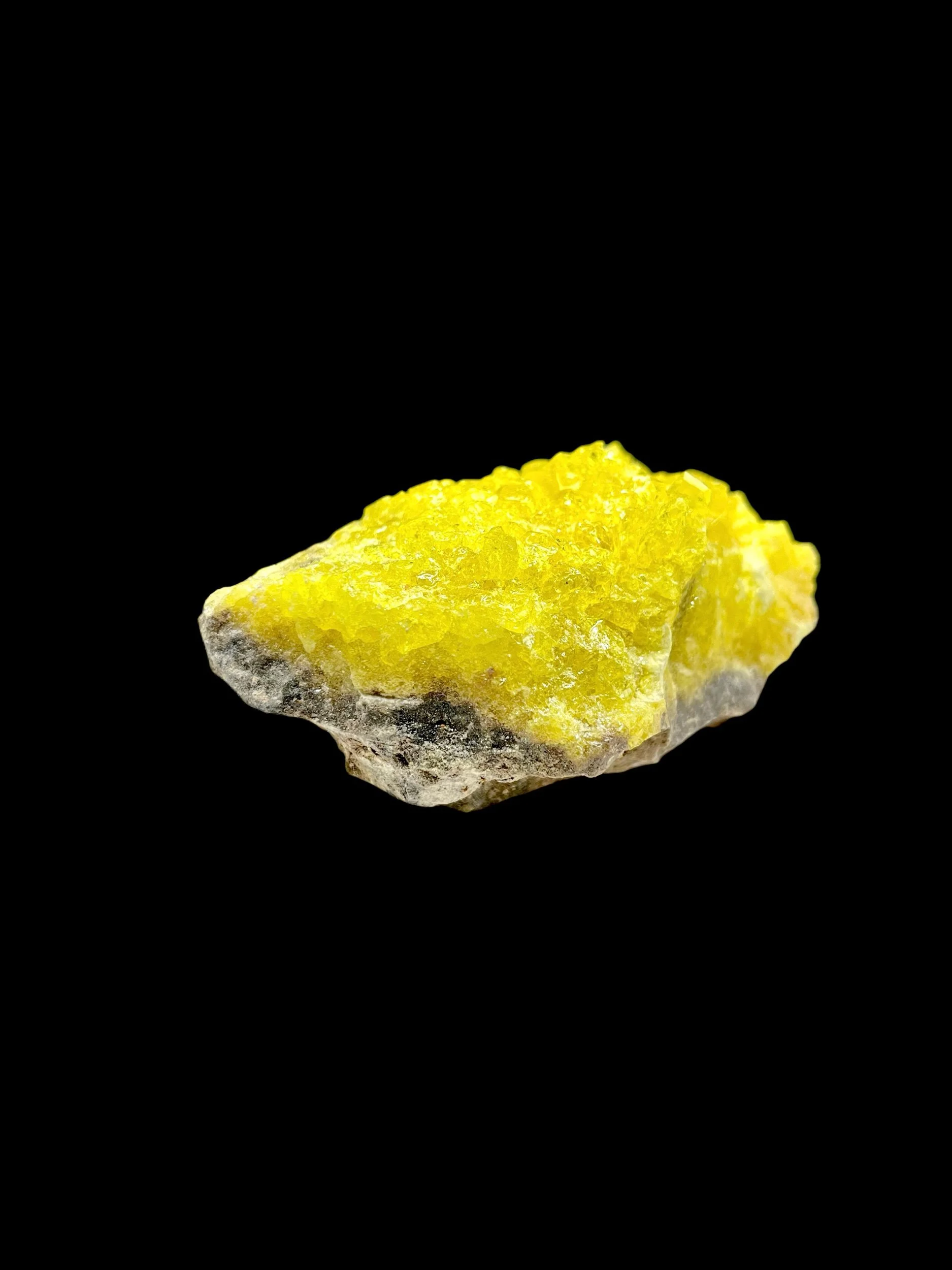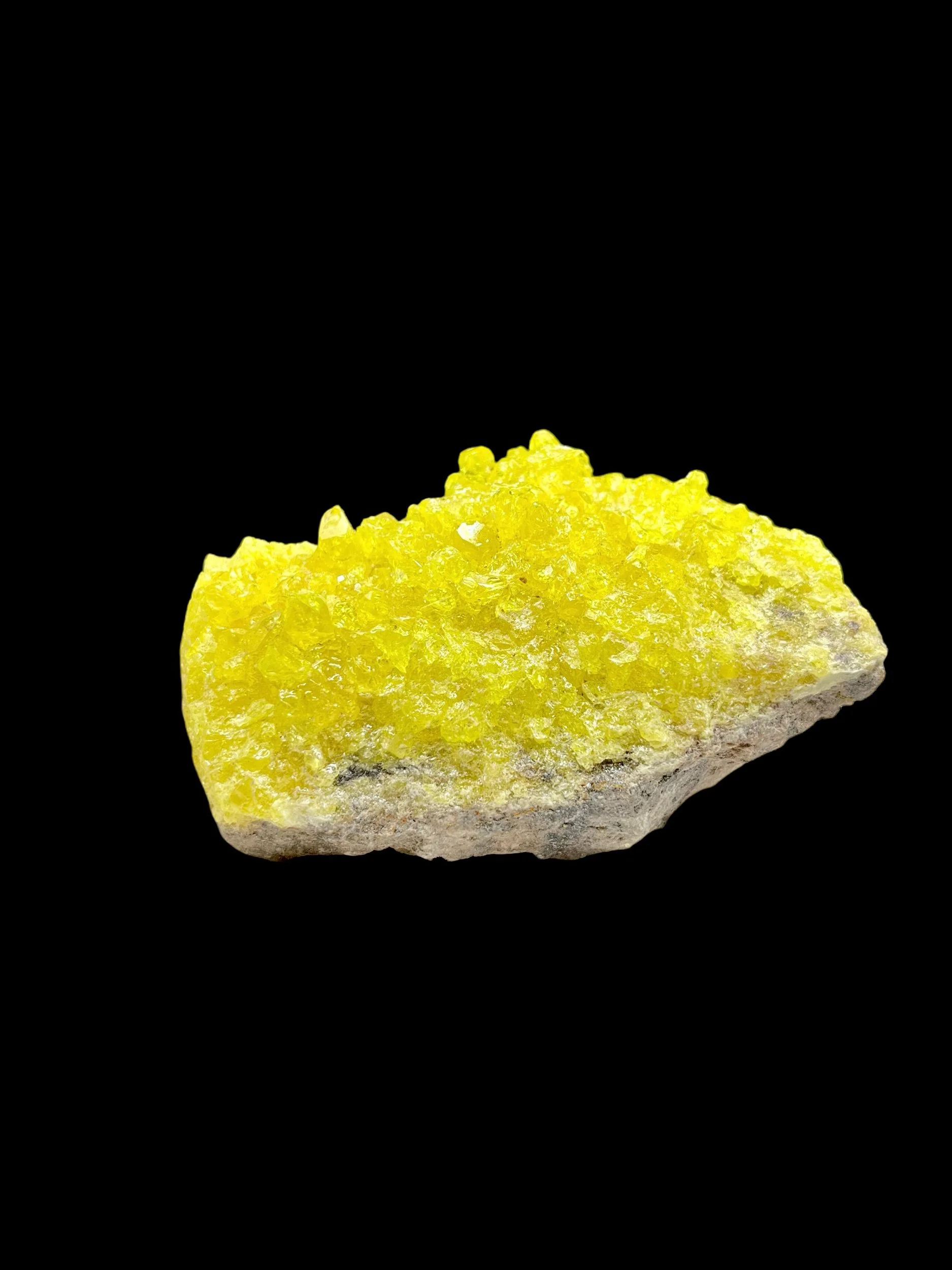 This exceptional natural sulphur specimen from Mexico showcases the element sulphur in its most striking and collectible crystalline form. Exhibiting an intense, saturated yellow coloration with a natural luster, this specimen is a powerful visual representation of elemental mineralogy. The sulphur crystals display excellent form and presence, offering both aesthetic impact and scientific intrigue.