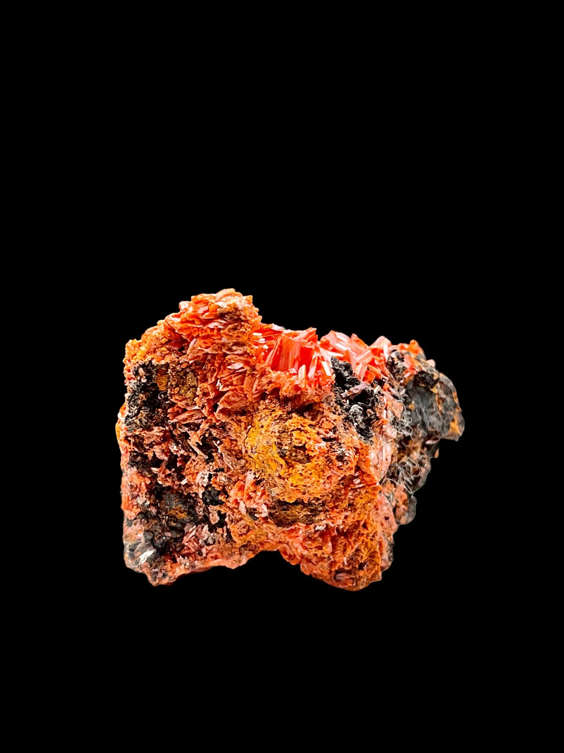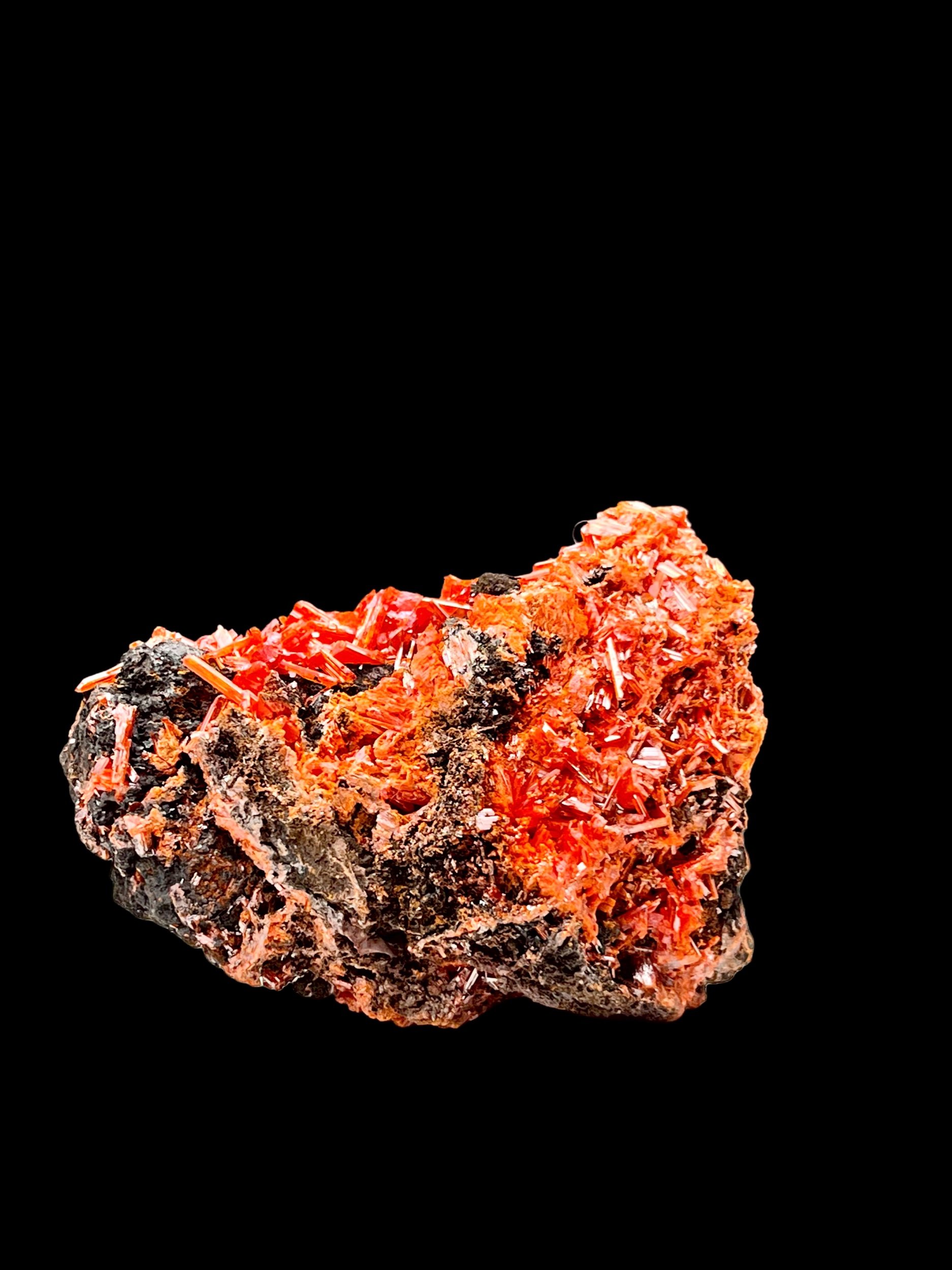 This specimen leans into the more dramatic side of Crocoite, with larger crystal development and a stronger visual weight than smaller cabinet pieces. The combination of bold prismatic crystals and underlying microcrystalline texture creates a balanced yet powerful aesthetic, ideal for collectors seeking a standout example from Dundas.