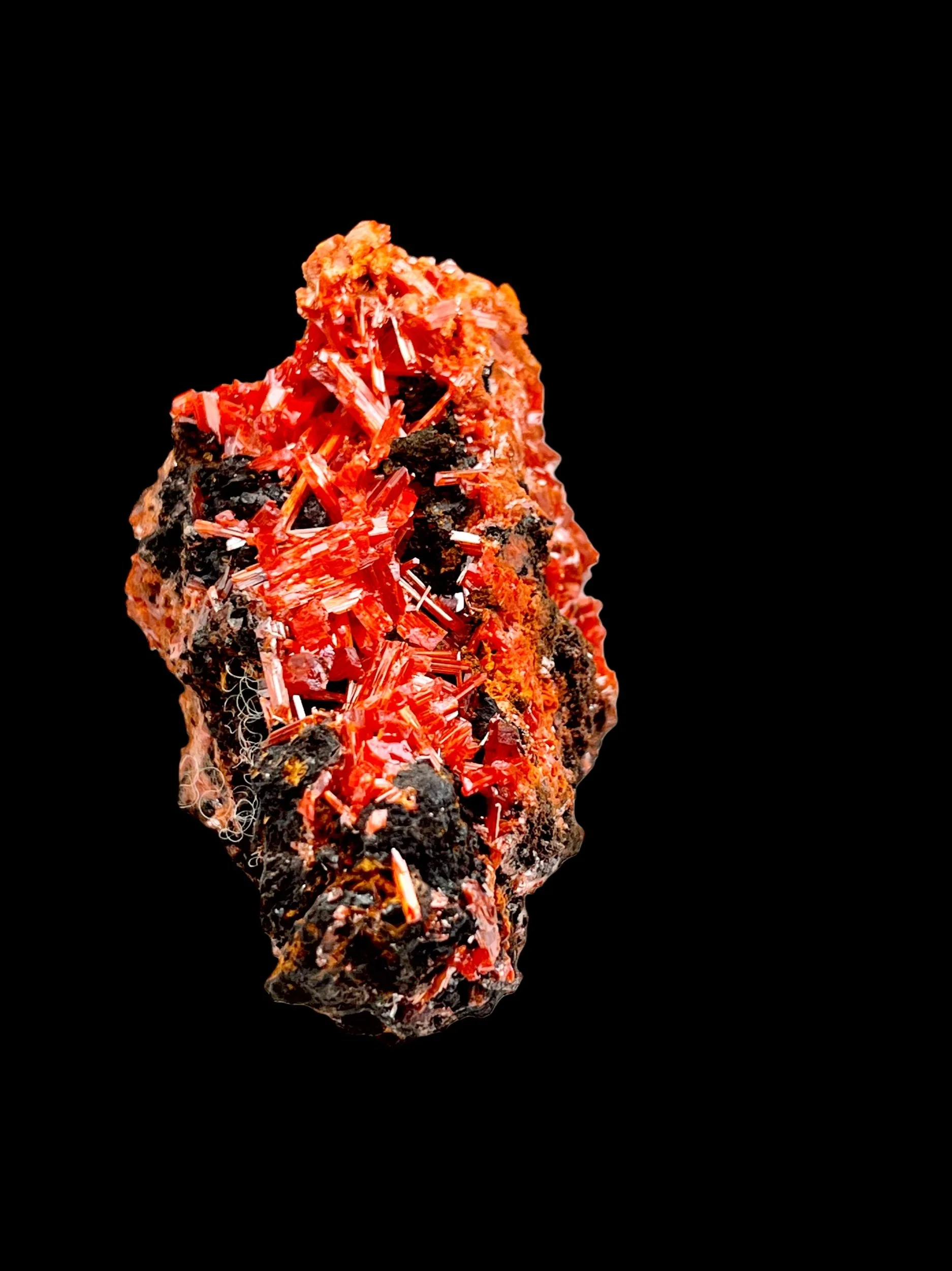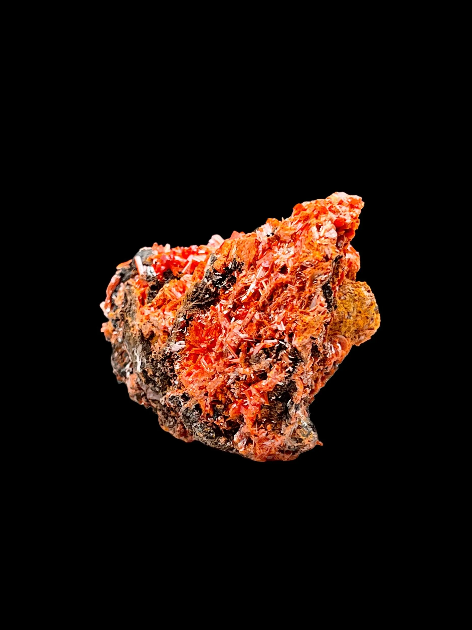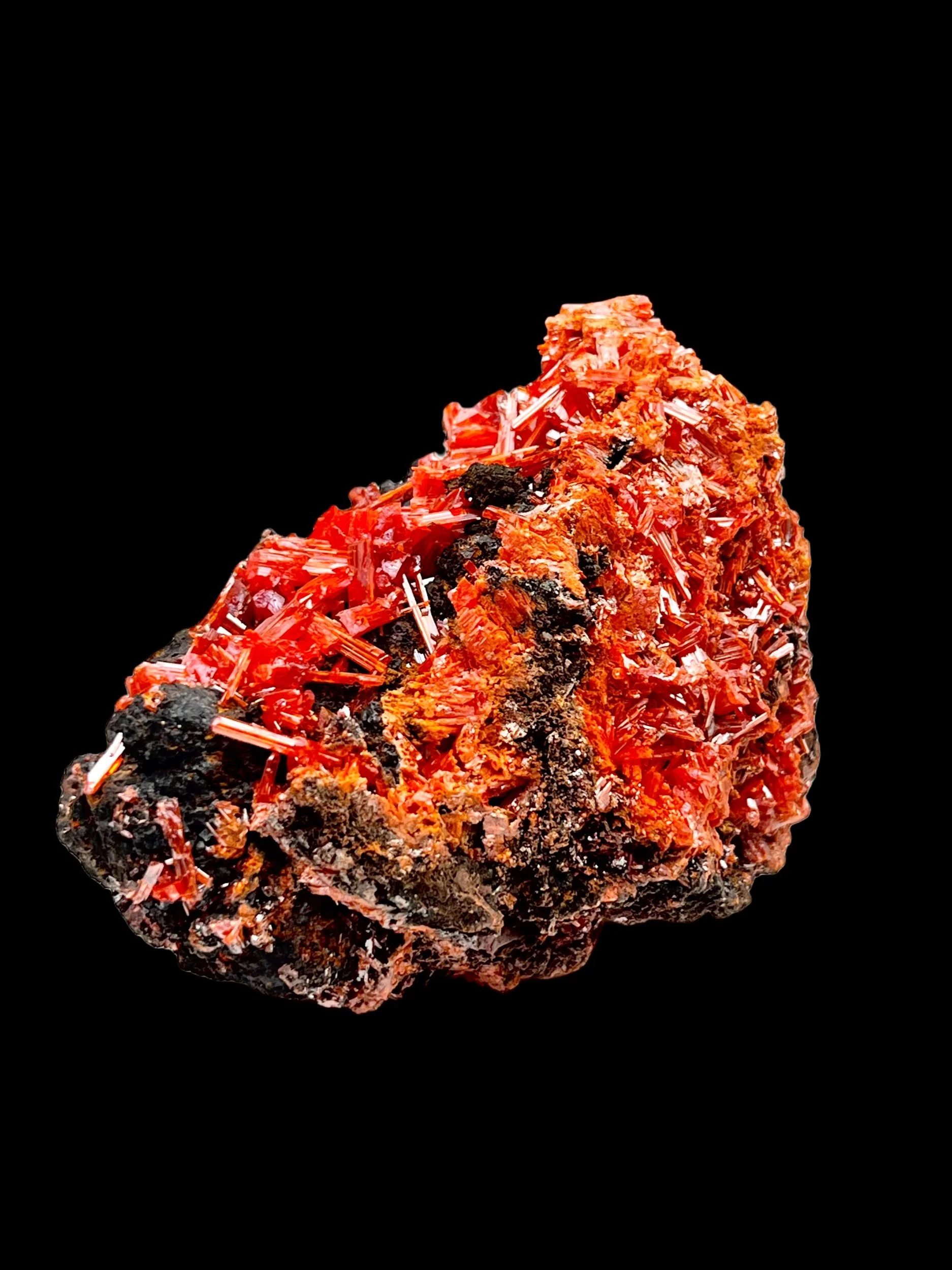 The crystals display a rich internal glow, with light penetrating the more translucent terminations and reflecting sharply off lustrous faces. The contrast between the vivid Crocoite and the darker, iron-rich matrix enhances the overall intensity, giving the specimen a strong, grounded presence while still showcasing the brilliance Dundas Crocoite is known for.