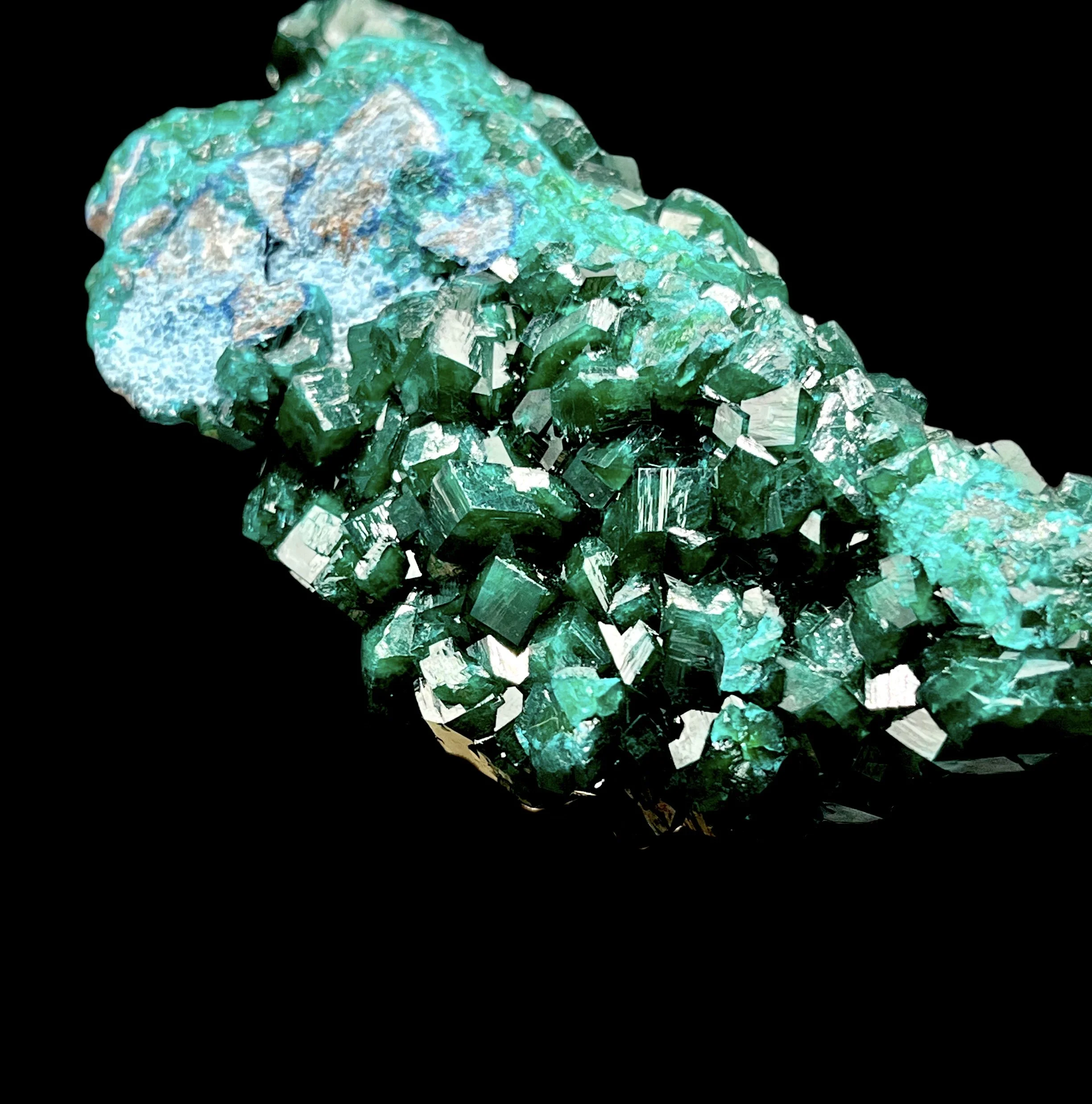 Along the matrix and between crystal groupings, subtle blue-green chrysocolla and deeper blue shattuckite provide tonal variation. These copper silicates soften the composition, creating a layered mineral landscape beneath the more structured dioptase growth.