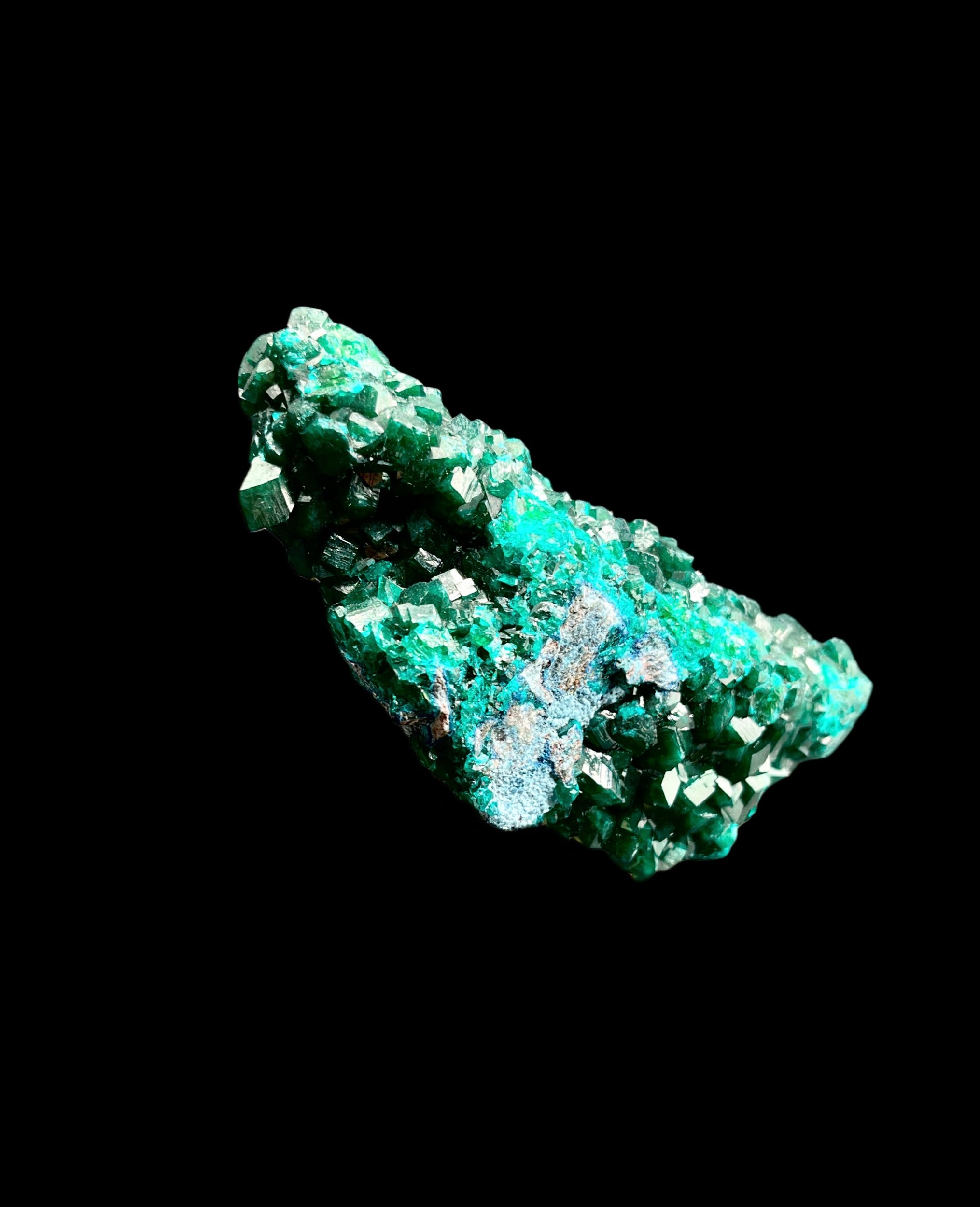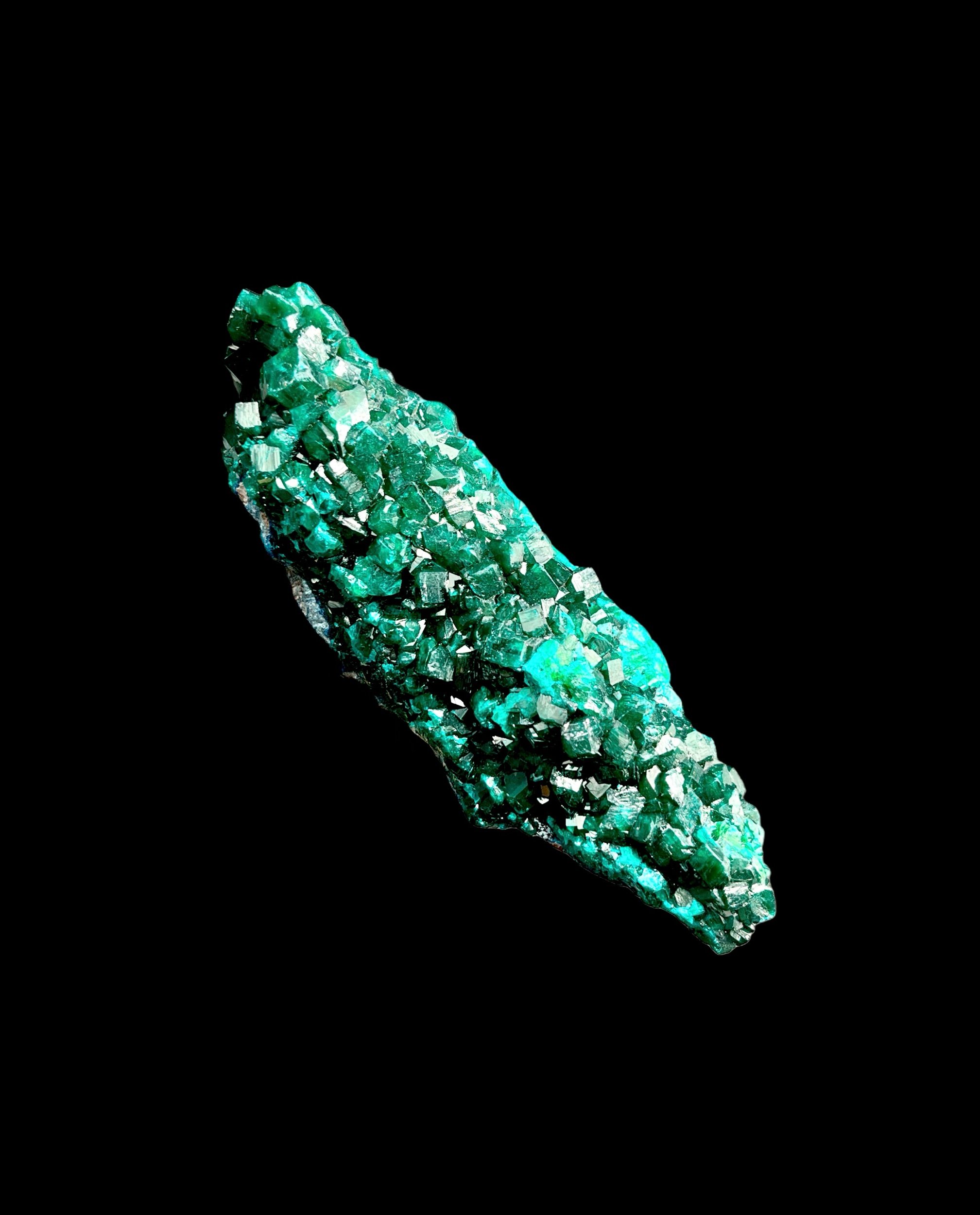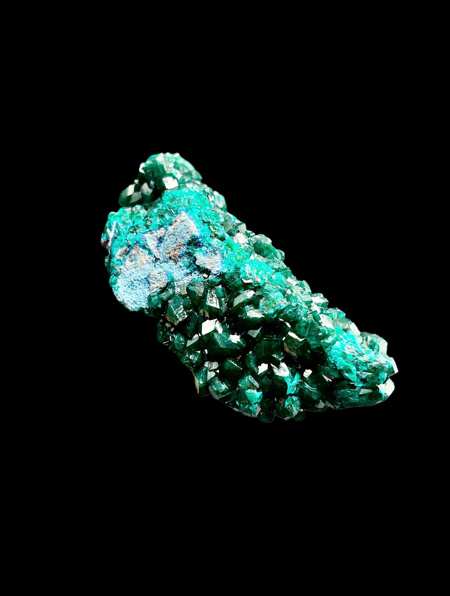 The dioptase crystals are well-defined and reflective, with crisp rhombohedral faces that catch light beautifully. Clarity and color saturation are strong and consistent throughout the piece.
