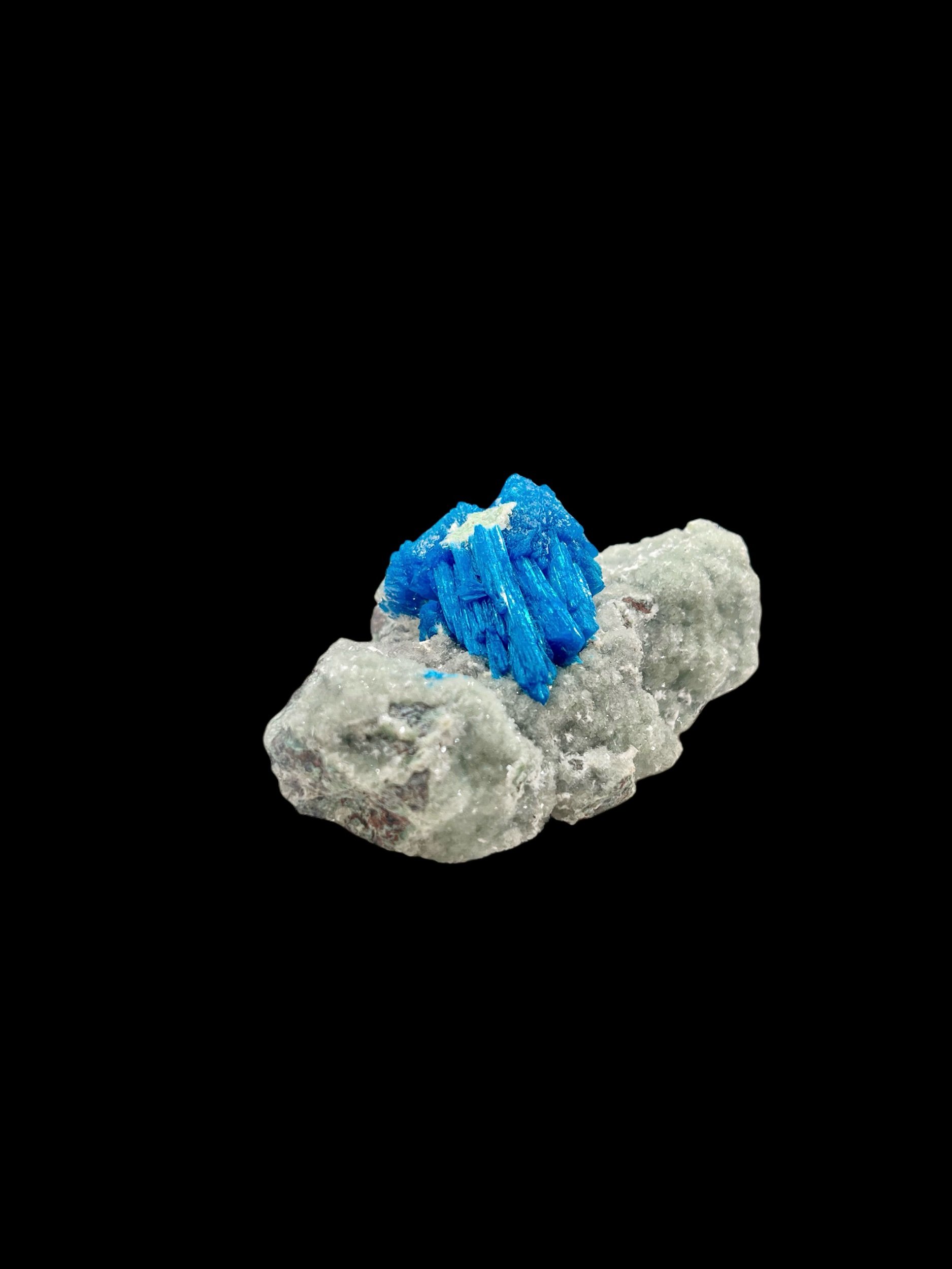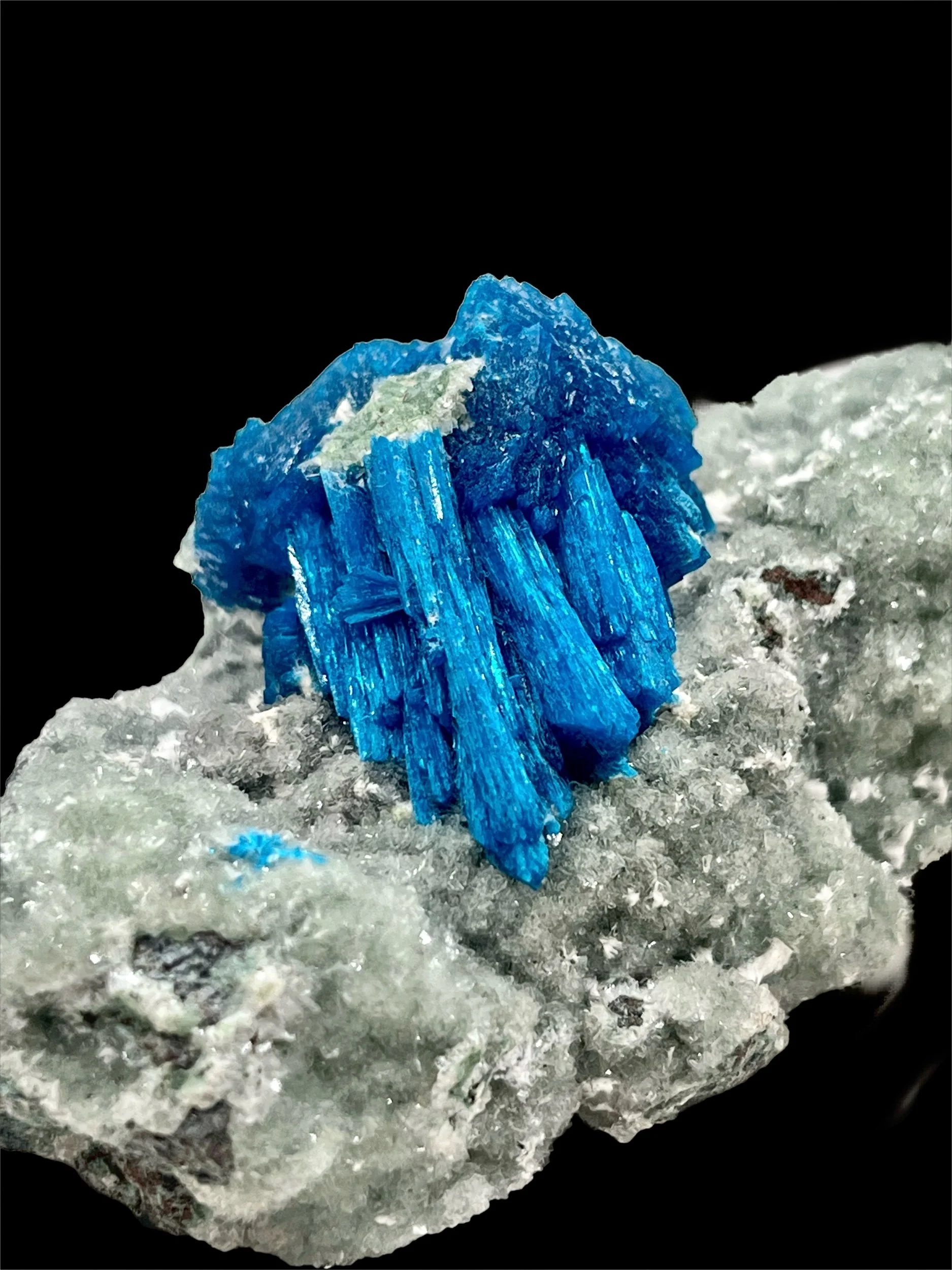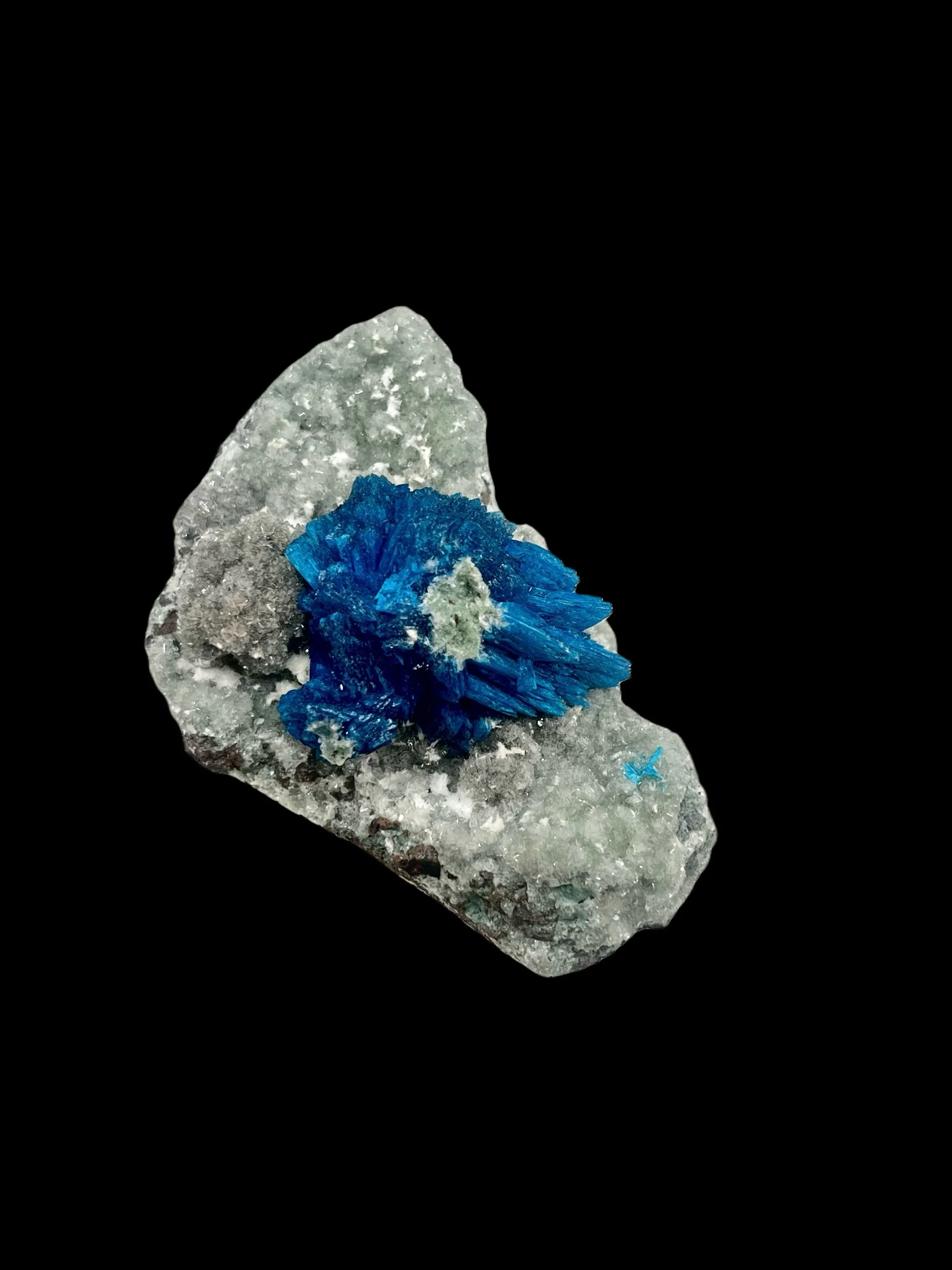 Cavansite is renowned for both its rarity and its vibrant color, a combination that has made fine specimens increasingly sought after by advanced collectors. The crystals on this piece display excellent luster and sharp definition, showcasing the mineral’s signature starburst habit that has made it one of the most recognizable zeolites in the world.