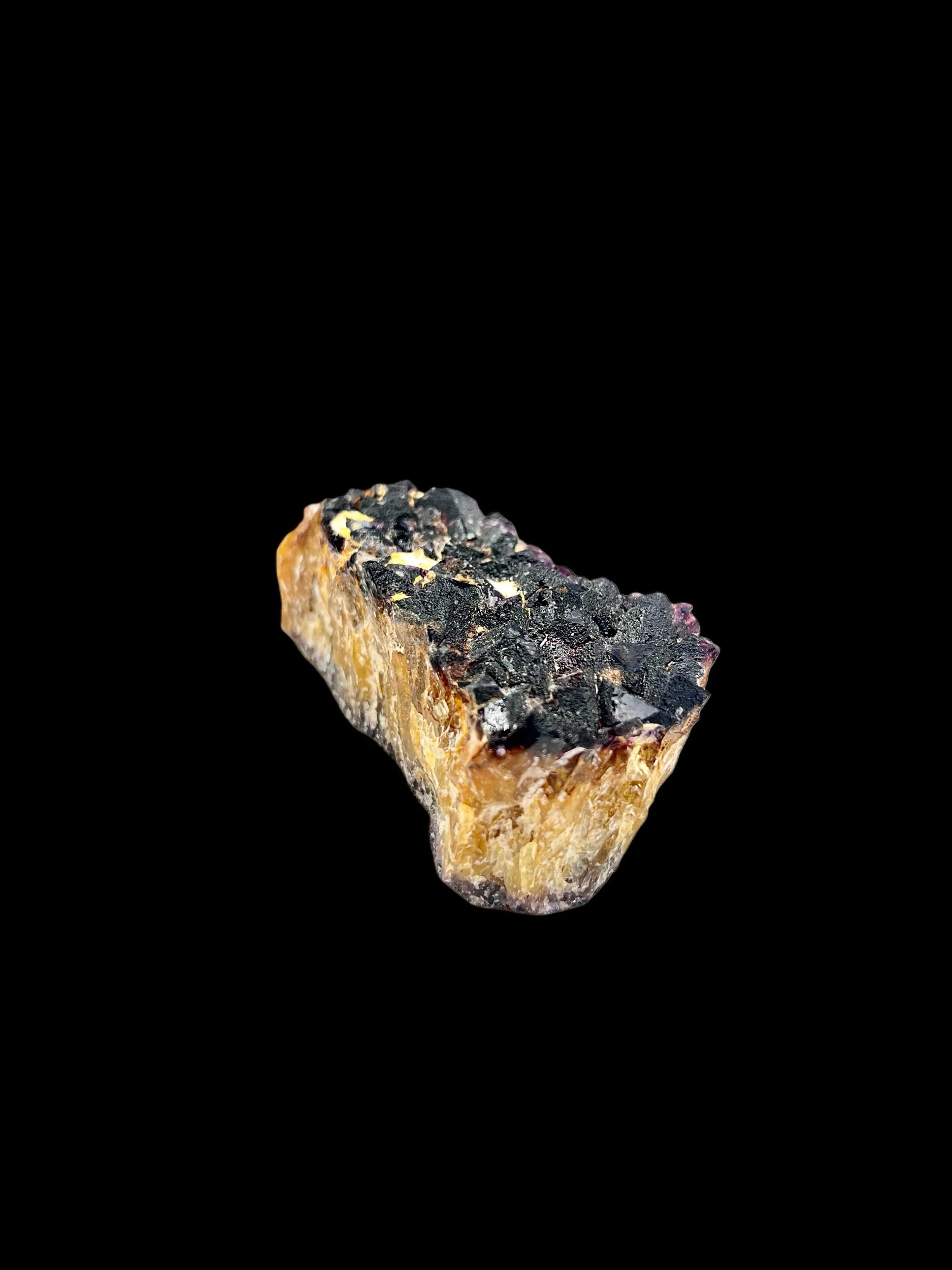 This striking black-tipped fluorite specimen features a dramatic color transition from warm honey-gold fluorite at the base to deep smoky-black terminations along the crystal tops. Subtle violet undertones appear beneath the darker surface layer, adding depth and complexity under changing light.
