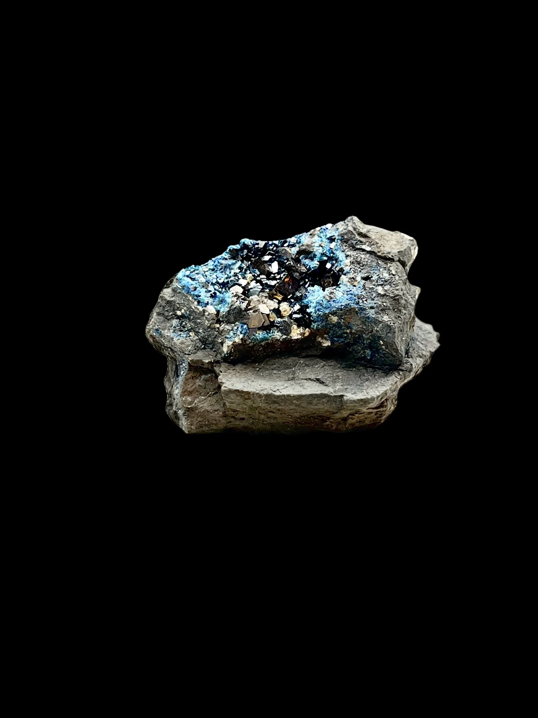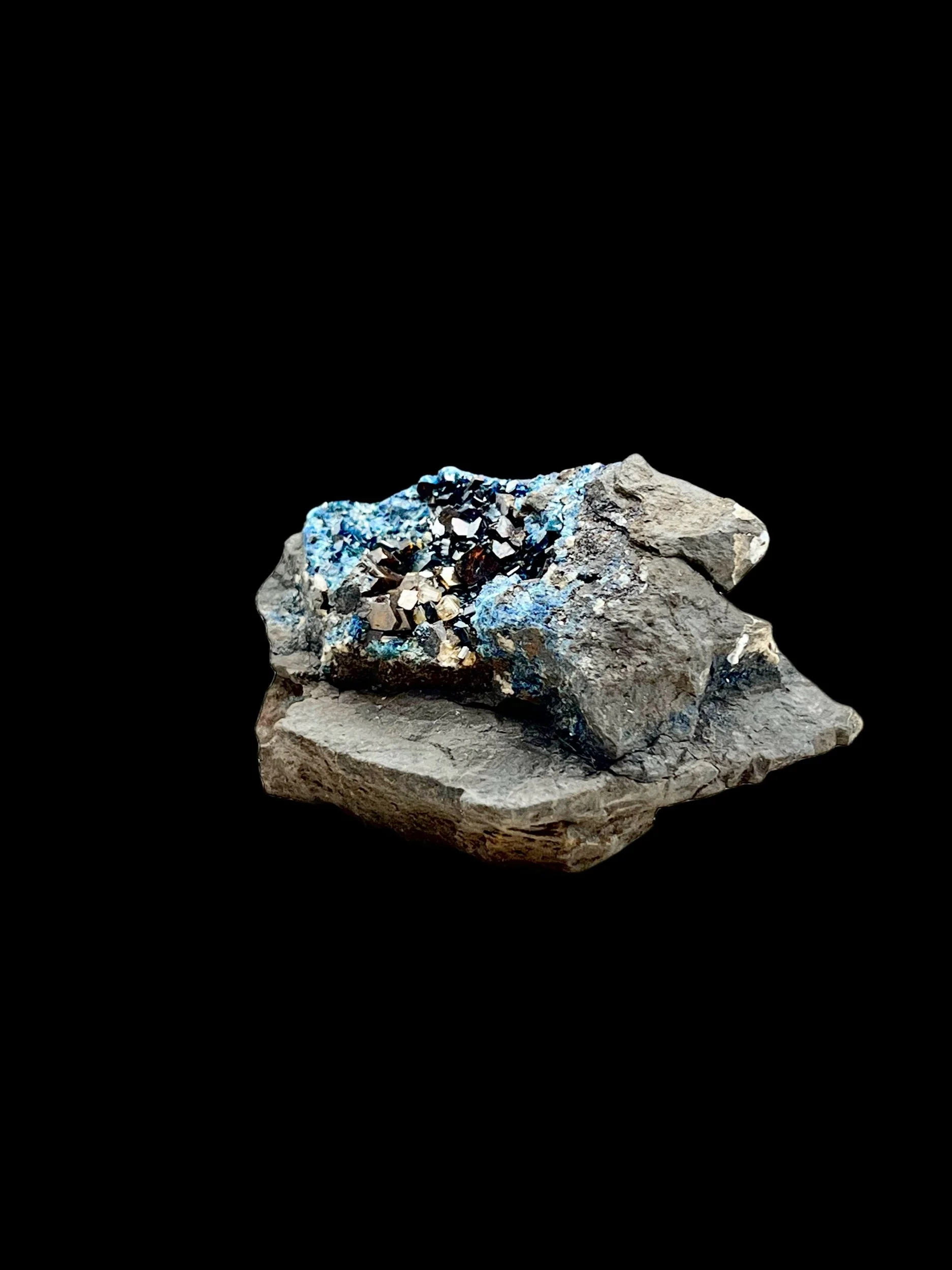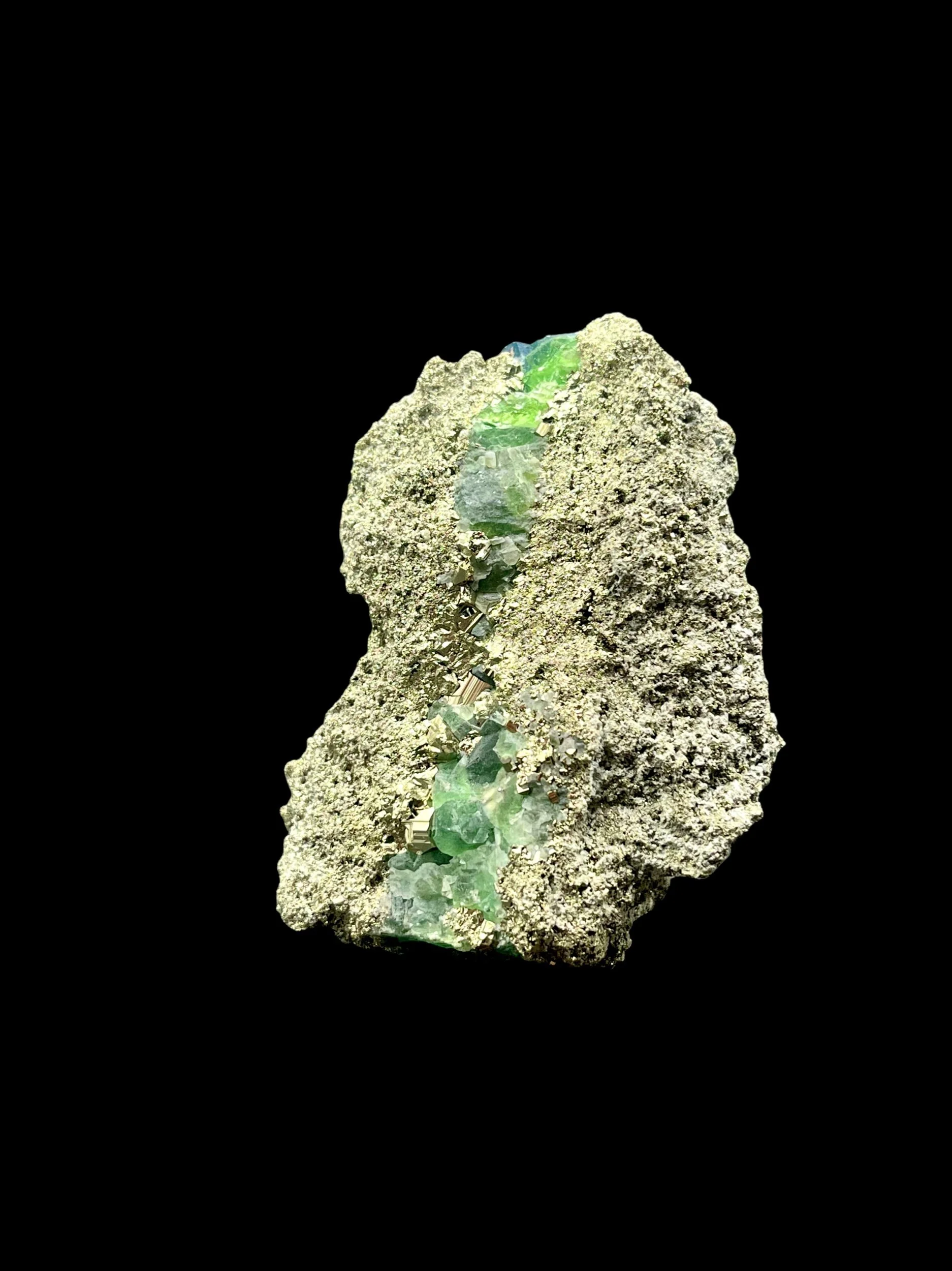 The contrasting matrix is coated in sparkling golden pyrite, creating an elegant metallic backdrop that highlights the fluorite’s vivid color. Under UV light, the fluorite glows an intense electric blue, adding yet another dimension to this already standout specimen.