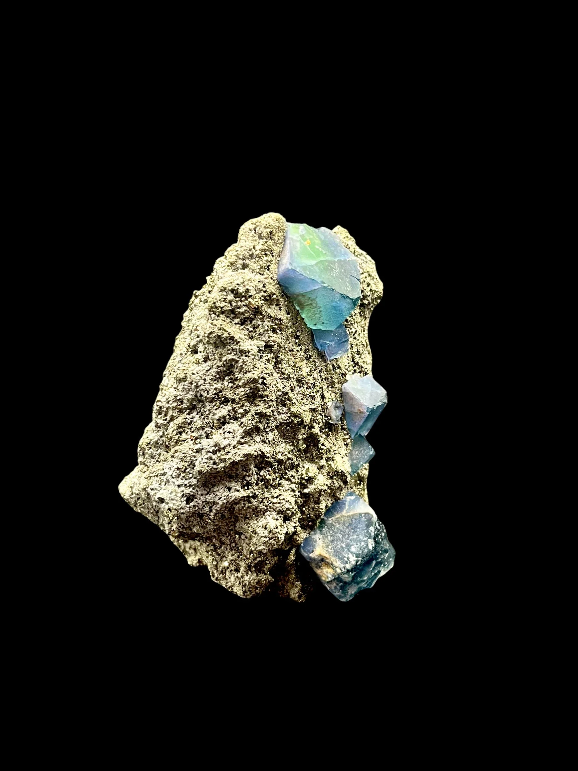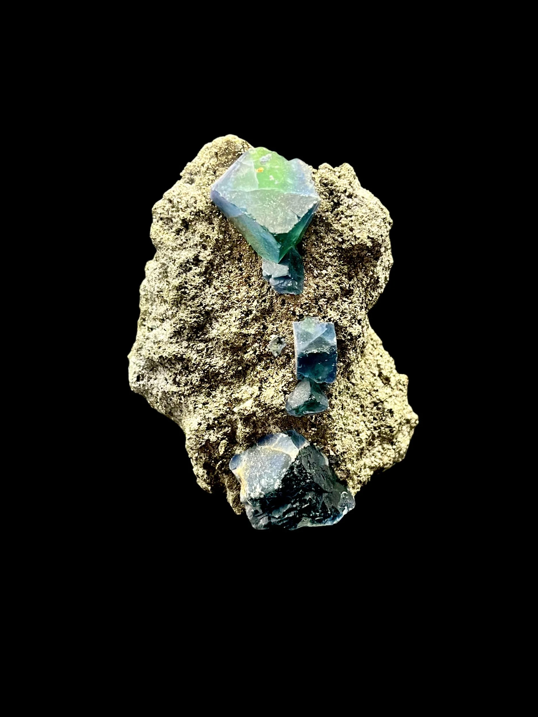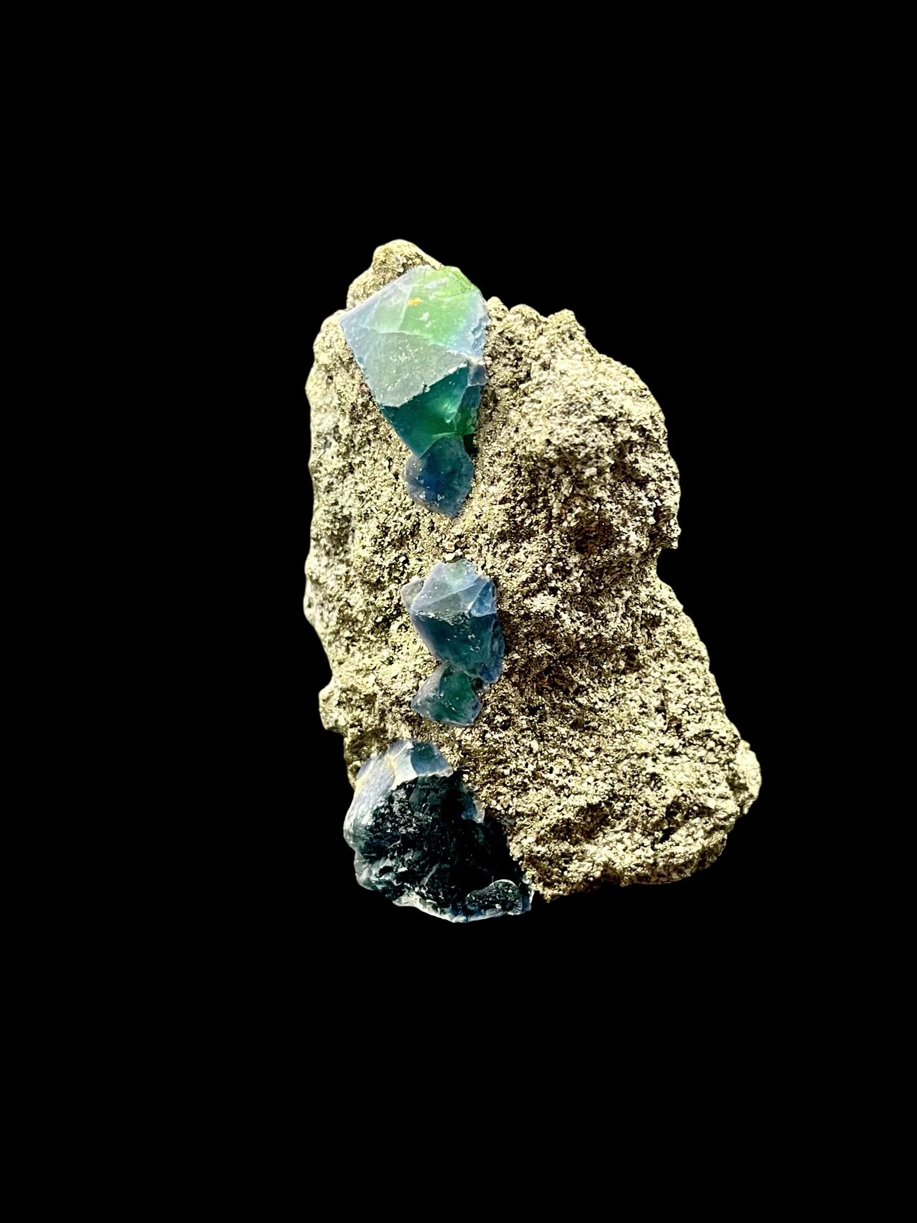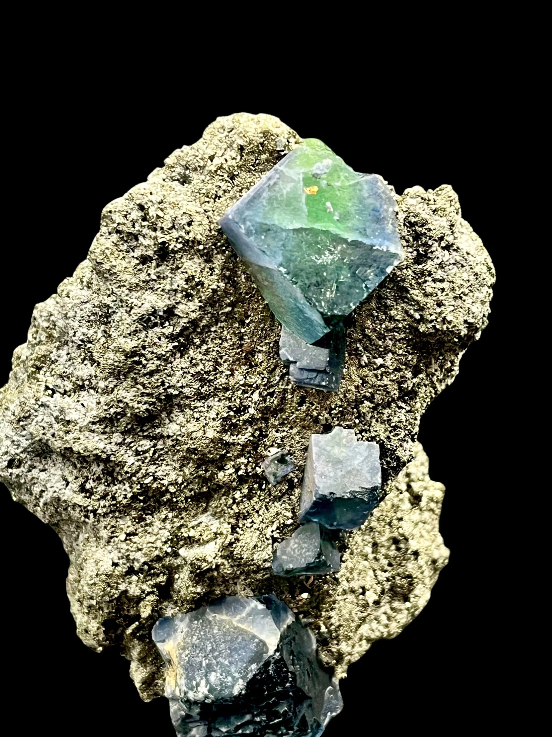 The pronounced blue and green zoning on the main fluorite cube makes this specimen especially rare. Distinct color zoning in fluorite occurs when trace elements and growth conditions shift during formation, creating natural bands or transitions in color. Well-defined examples like this are highly sought after by collectors.
