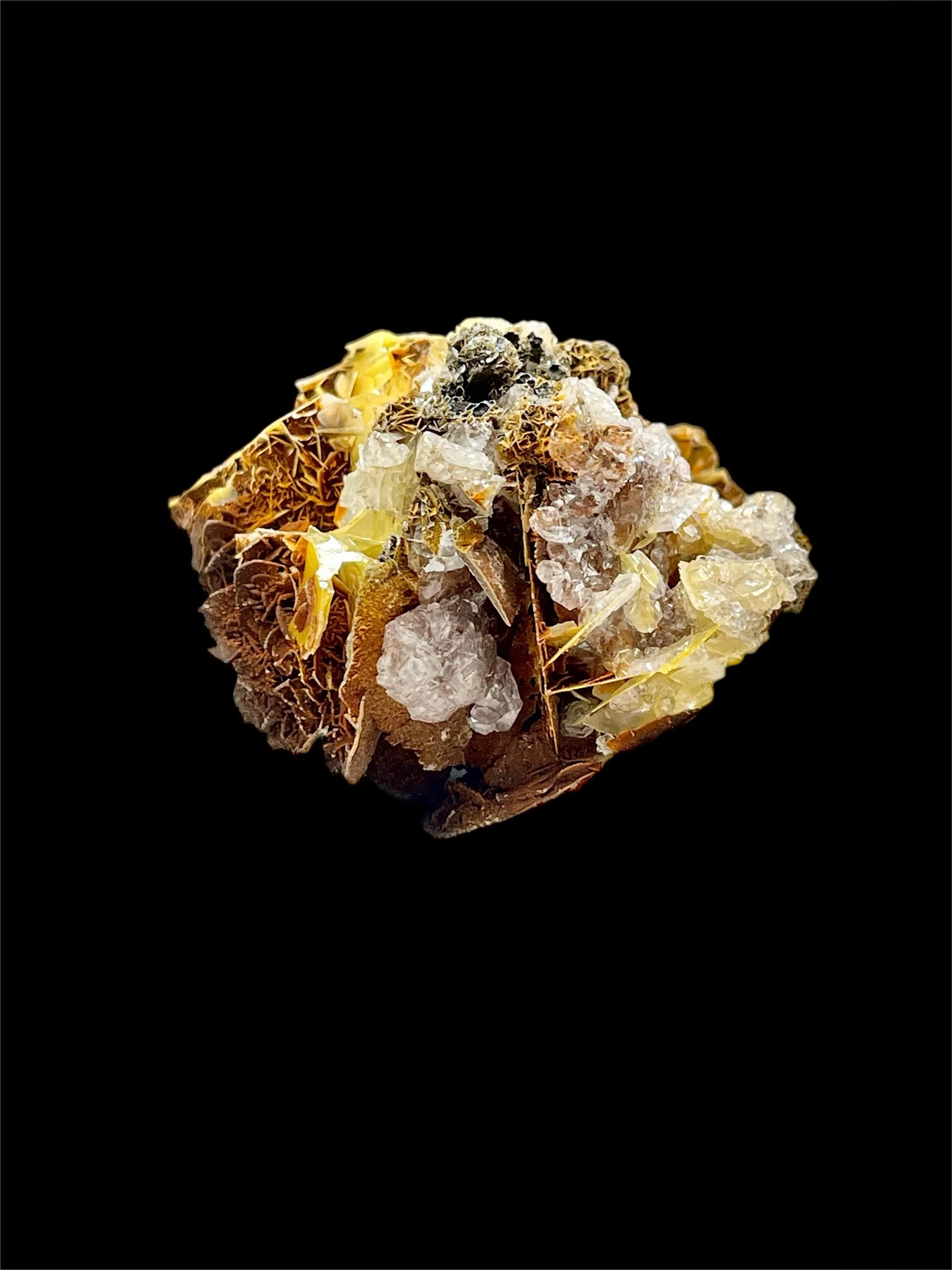 Fine lustrous wulfenite crystals — radiant in tones of golden-yellow are gracefully intertwined with gemmy calcite and descloizite. The contrast is mesmerizing: warm sunlight captured in crystal, rising from metallic shadows.