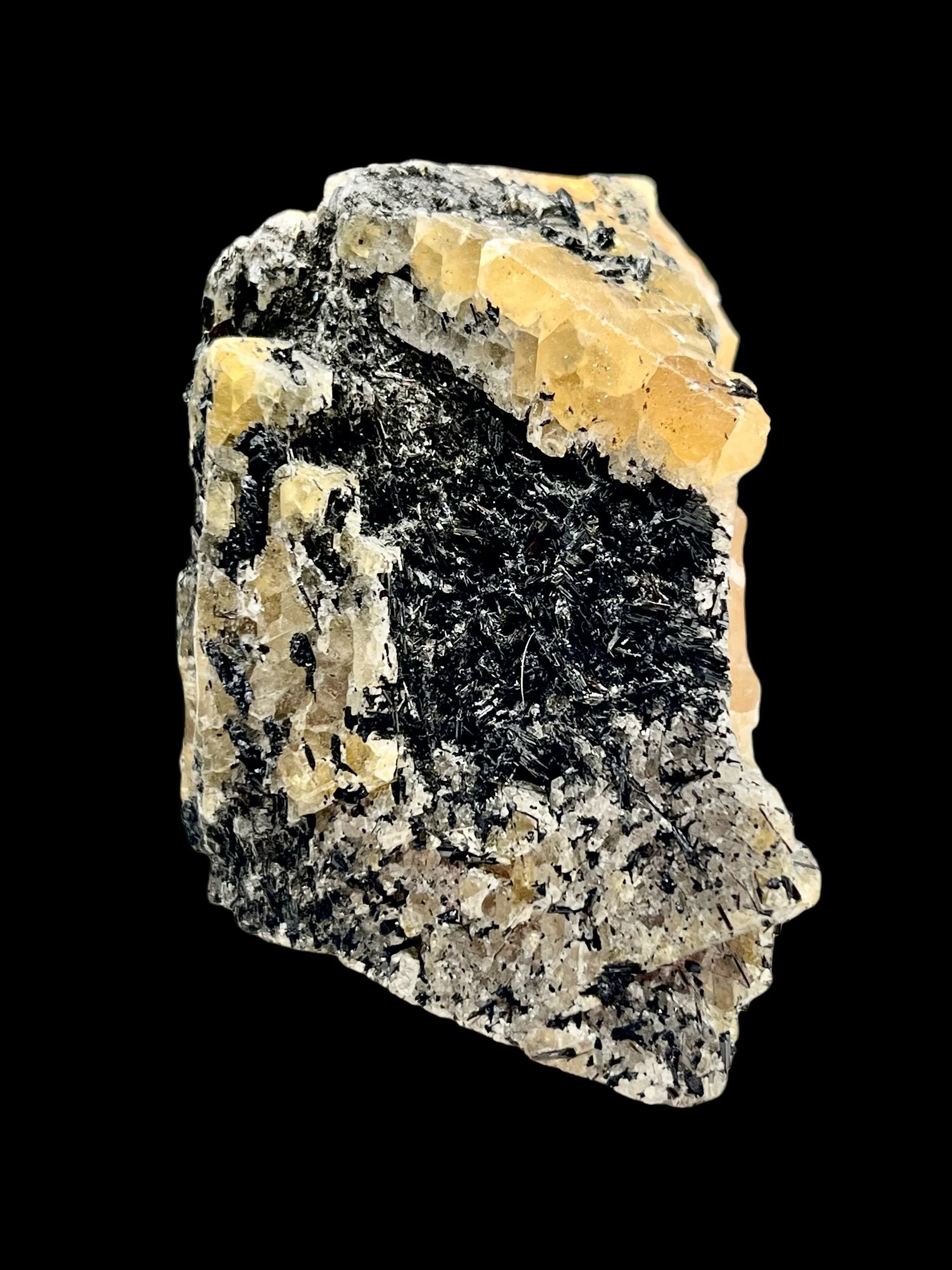 This striking mineral specimen features fluorescent scheelite crystal dramatically contrasted by black tourmaline (schorl), creating a bold interplay of light and dark. In normal lighting, the tourmaline’s jet-black prismatic form anchors the specimen visually, while under short wave ultraviolet light, the scheelite comes alive with its signature intense blue-white glow, transforming the piece into a true UV showstopper. Under long wave in light, the scheelite glows a soft sunset pinkish orange.