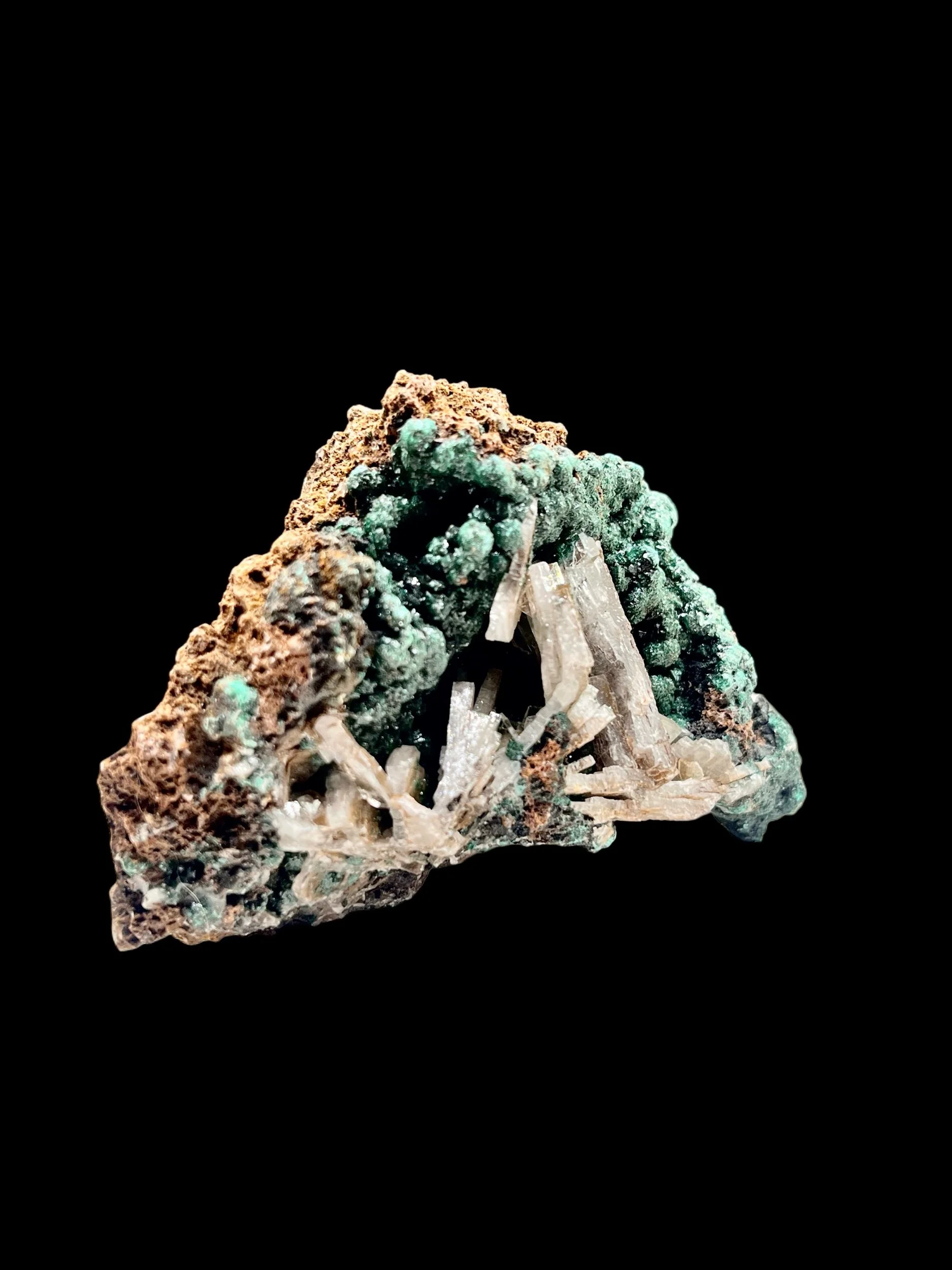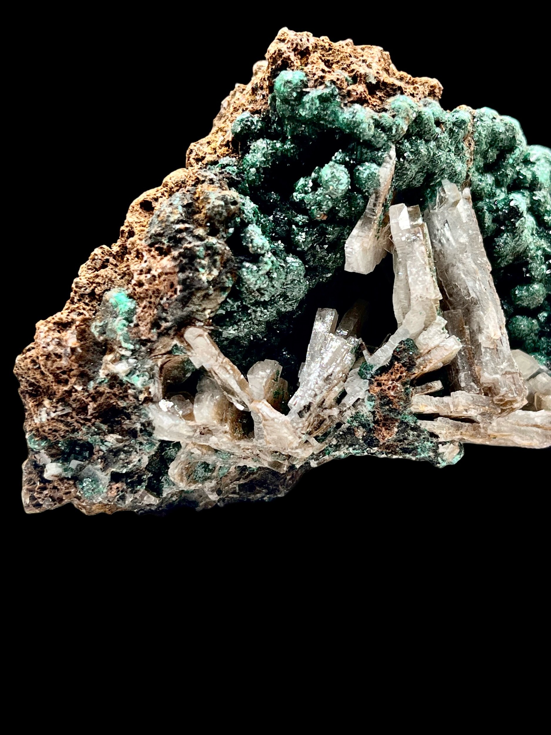 Presenting an extraordinary Malachite with Barite specimen that stands as both a mineralogical treasure and a work of natural art—crafted not by human hands, but by the slow, deliberate choreography of geological time. This piece is curated specifically for collectors who value rarity, sculptural presence, and investment-grade mineral aesthetics.