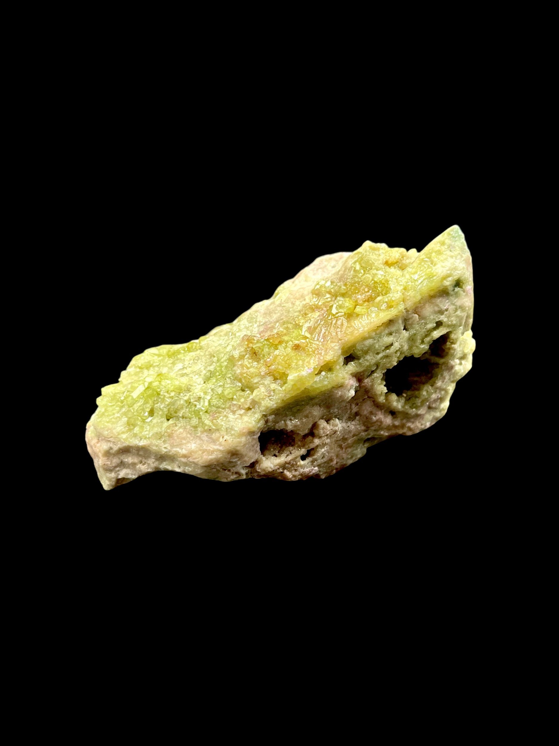 Under longwave UV light, this Vesuvianite specimen display a striking sunset pink to orange fluorescence. The reaction appears in scattered speckles and patches across the piece, adding an unexpected hidden feature that makes this specimen especially captivating both in daylight and under ultraviolet light.