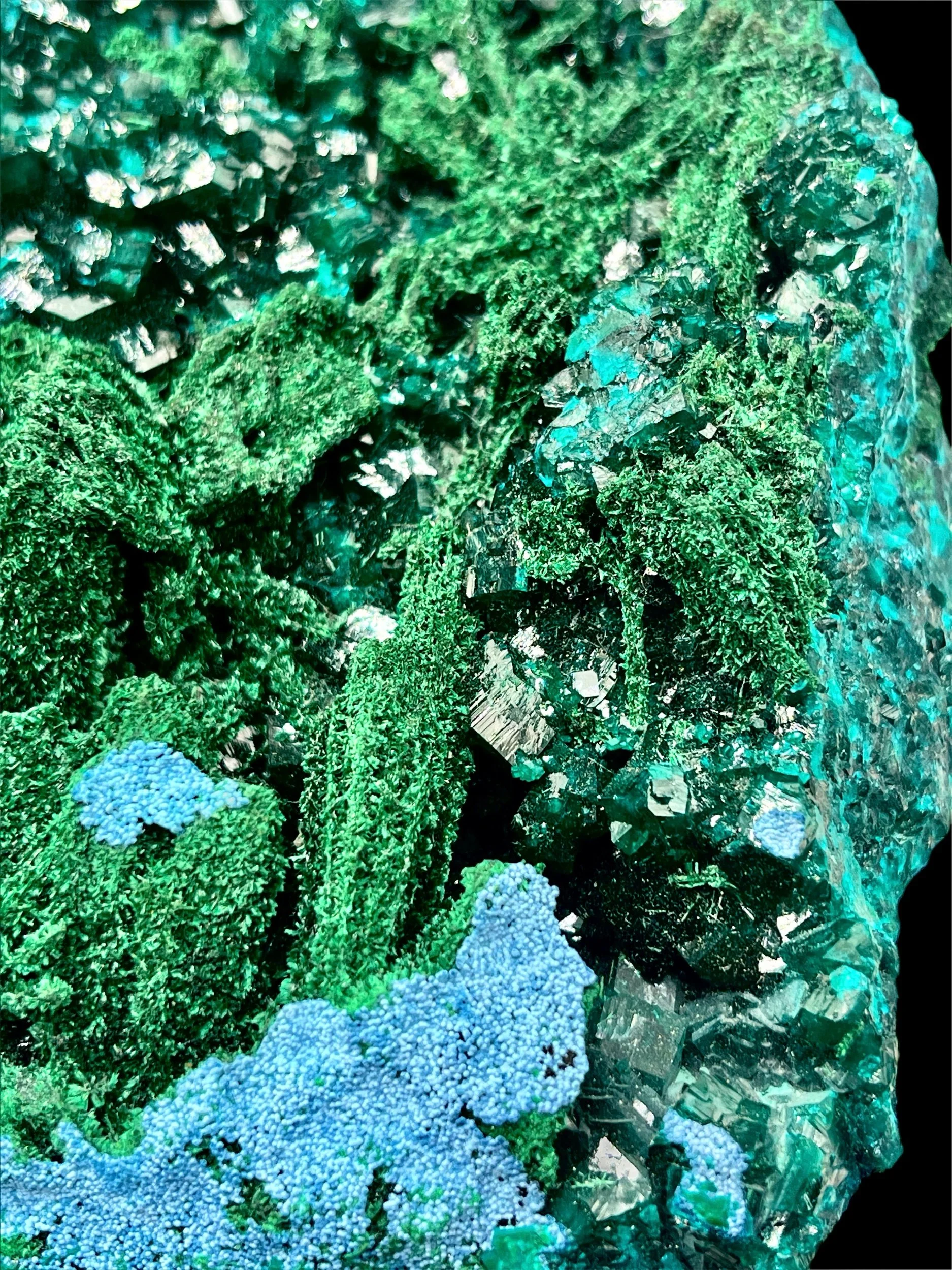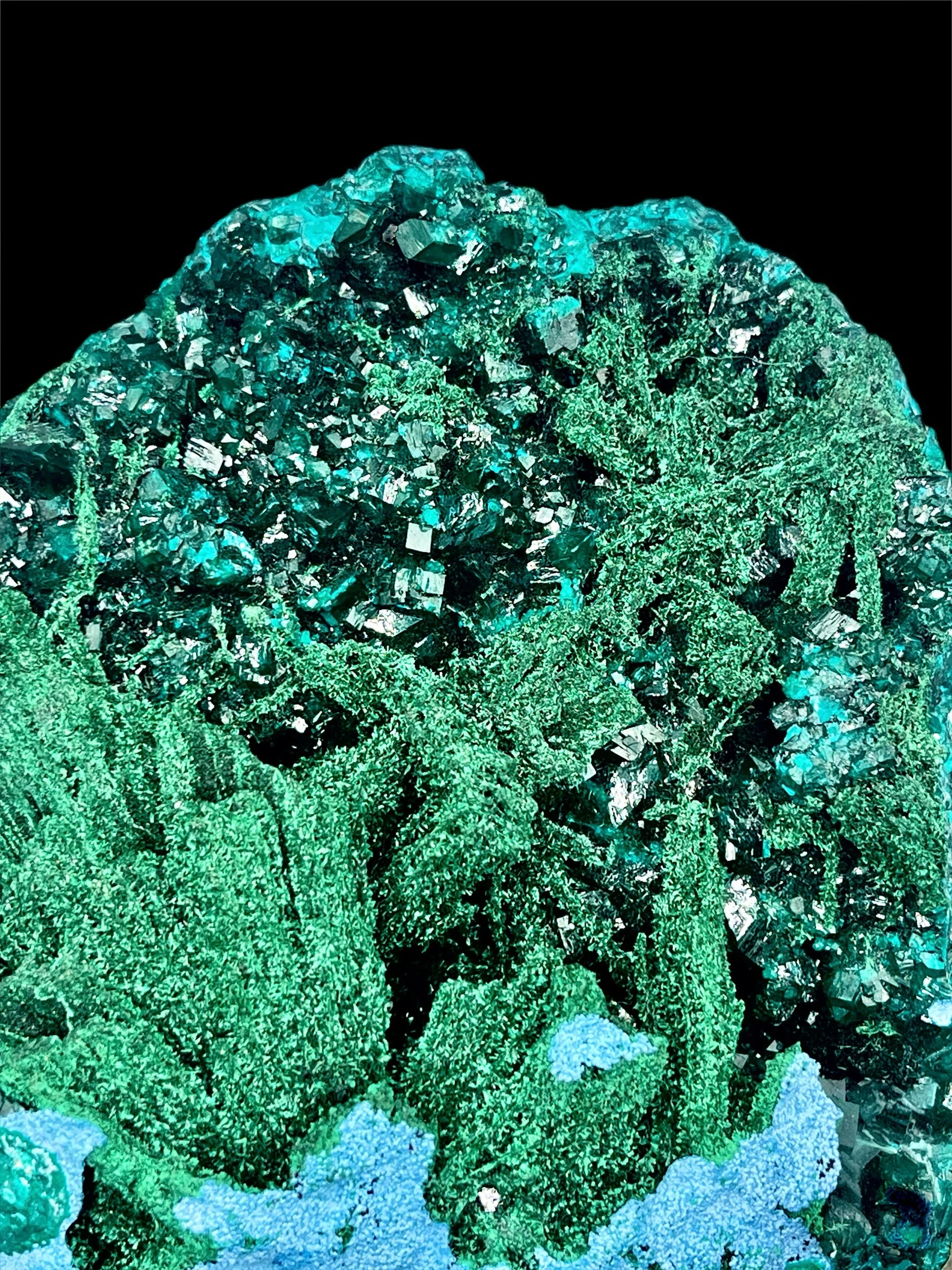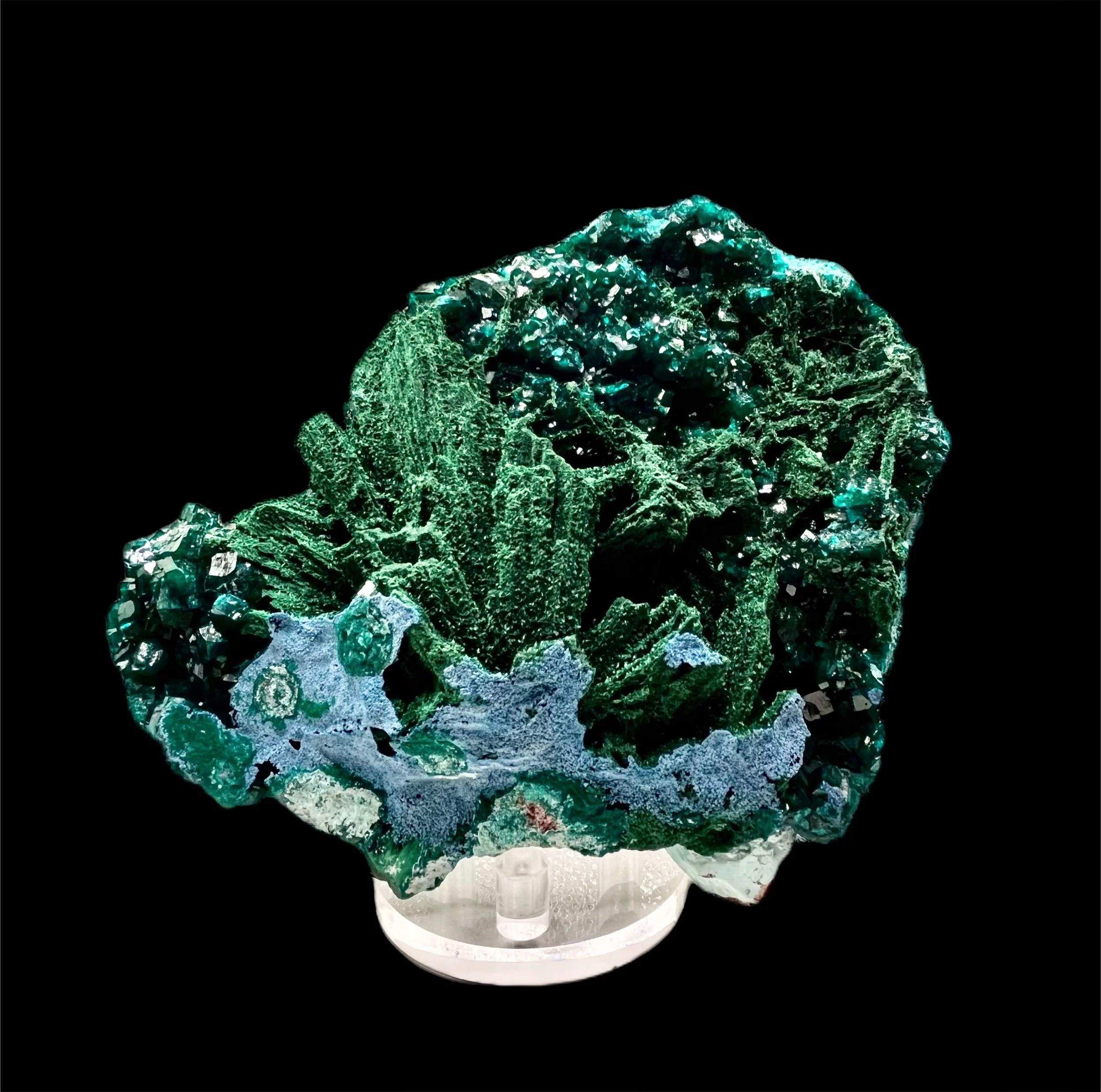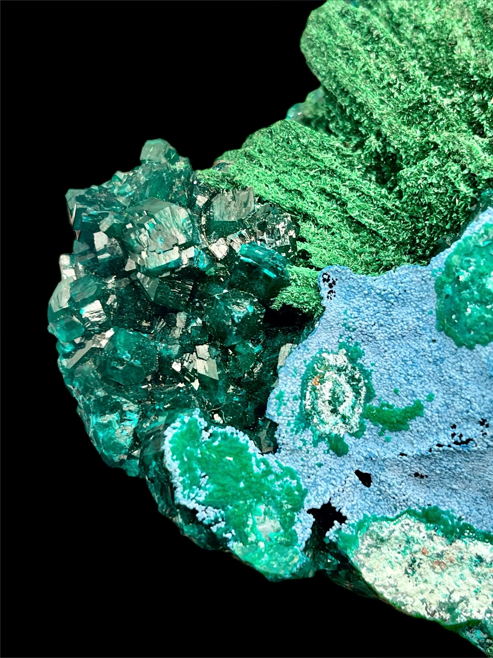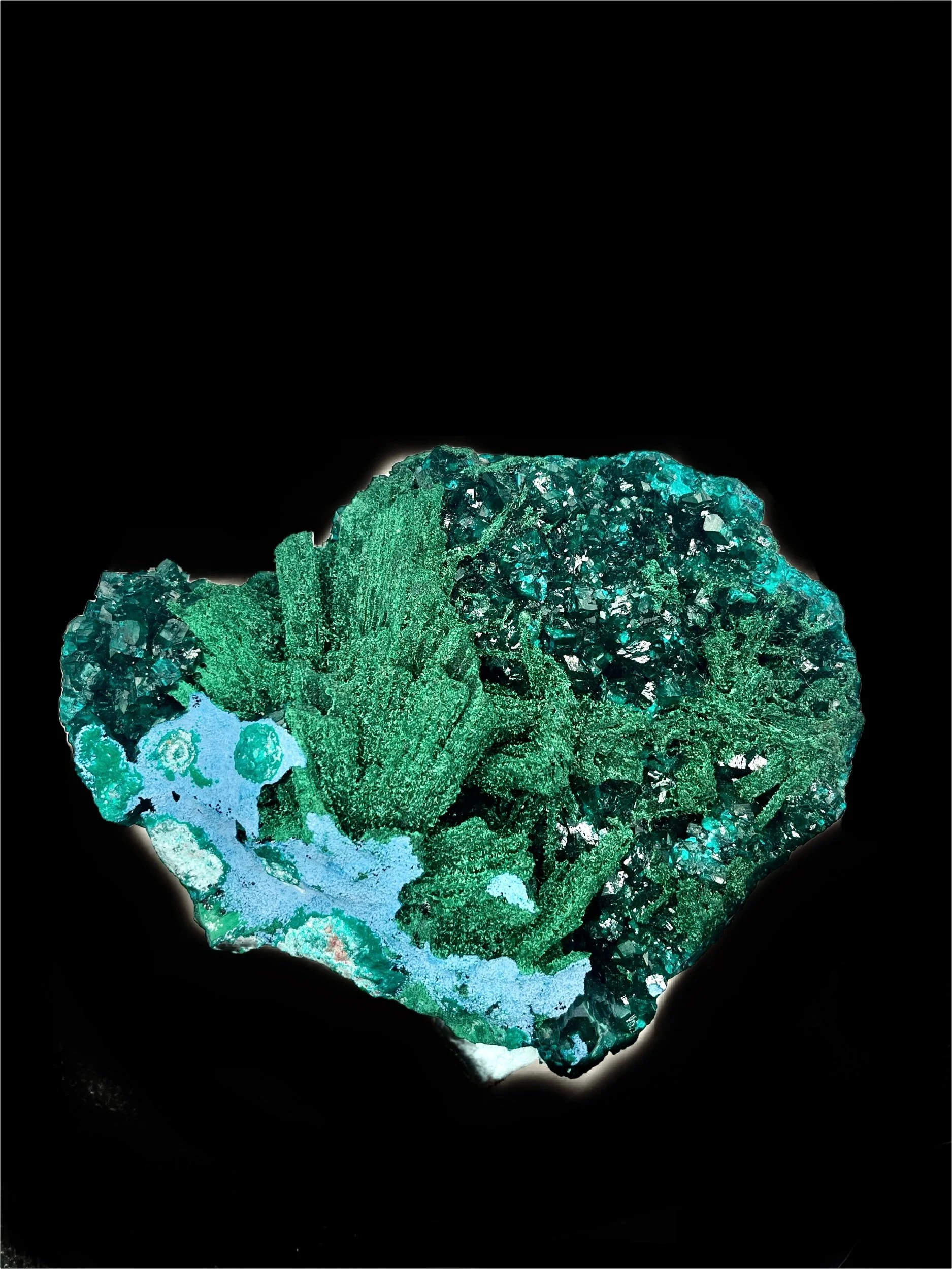 Vivid emerald-green dioptase crystals, with brilliant luster and depth, rest on richly textured fibrous malachite and chrysocolla. The harmony between the two greens — one bright and crystalline, the other dark and velvety— creates a mesmerizing interplay of light that is only highlighted by the contrast of the brilliant blue chrysocolla.