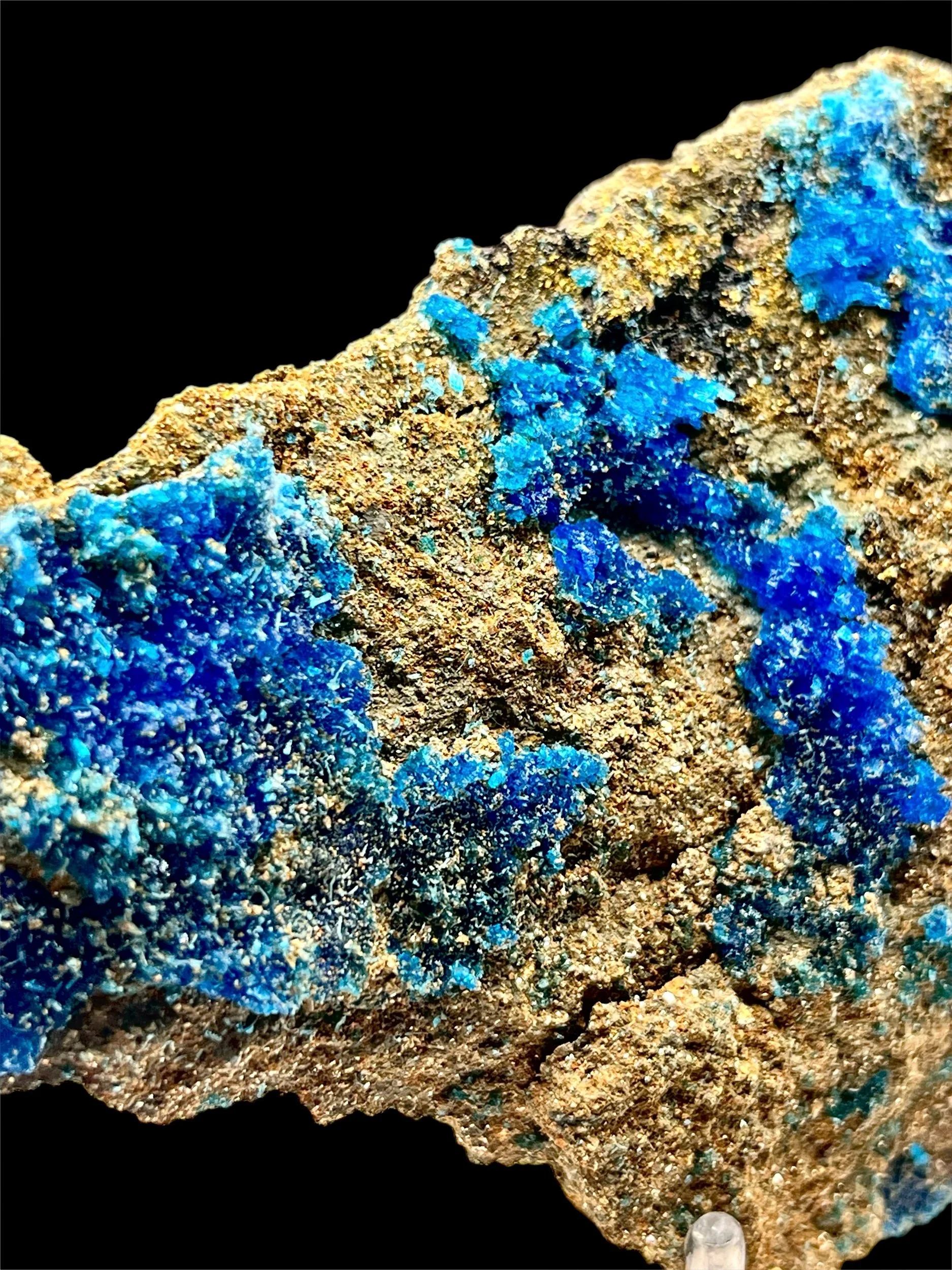 An electric blue chalcanthite cluster enhanced by radiant metallic pyrite—an otherworldly marriage of crystalline water and golden fire. The intense color contrast creates a dynamic, almost surreal visual experience.