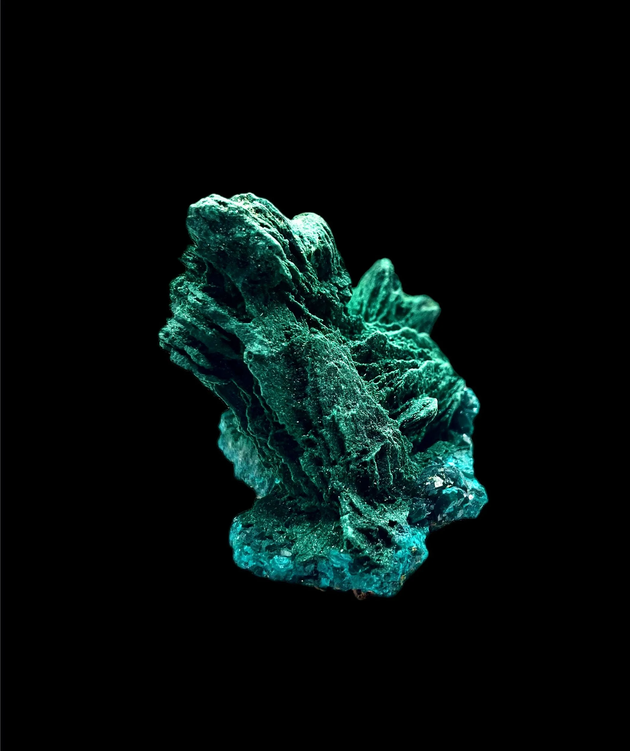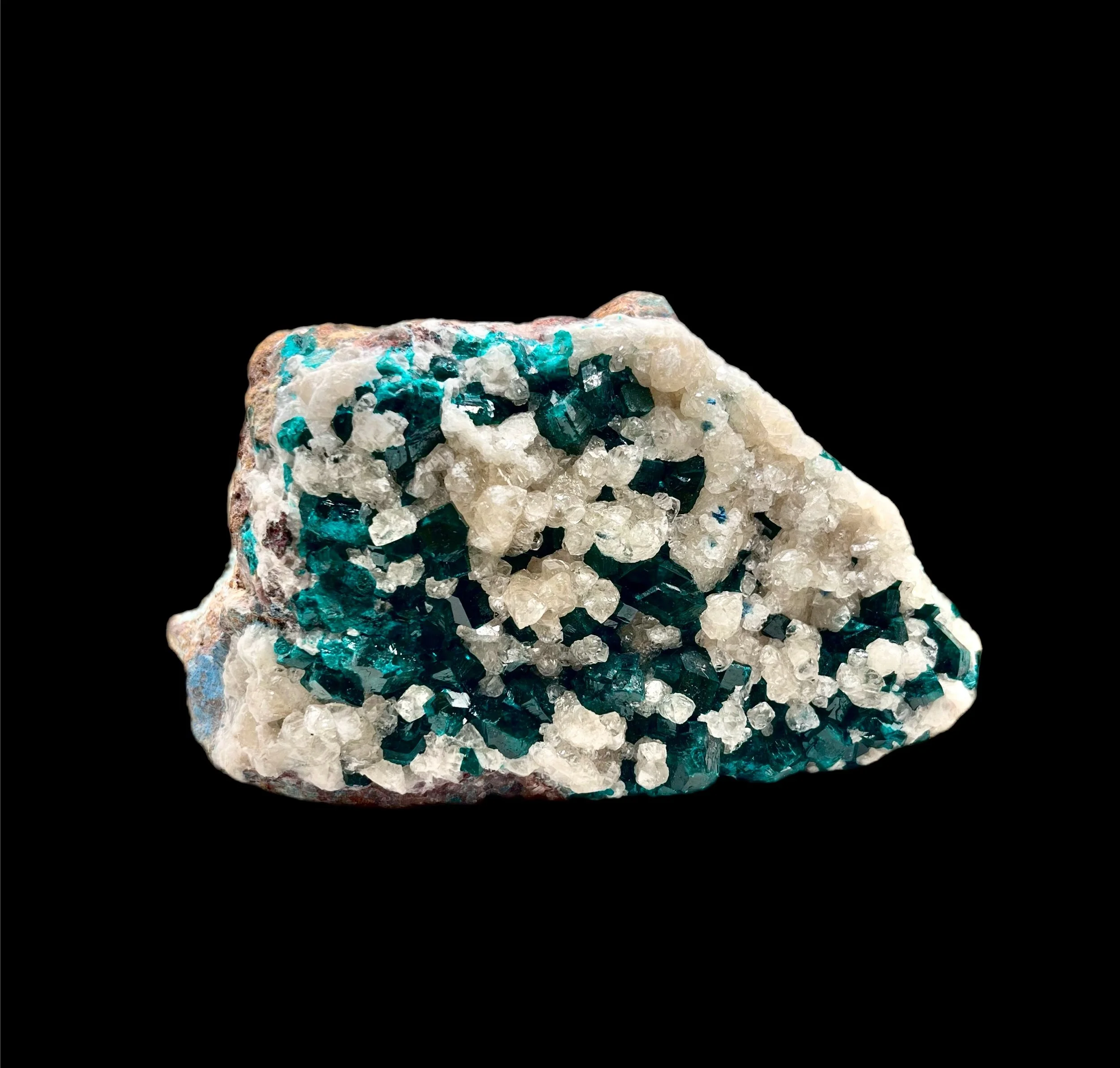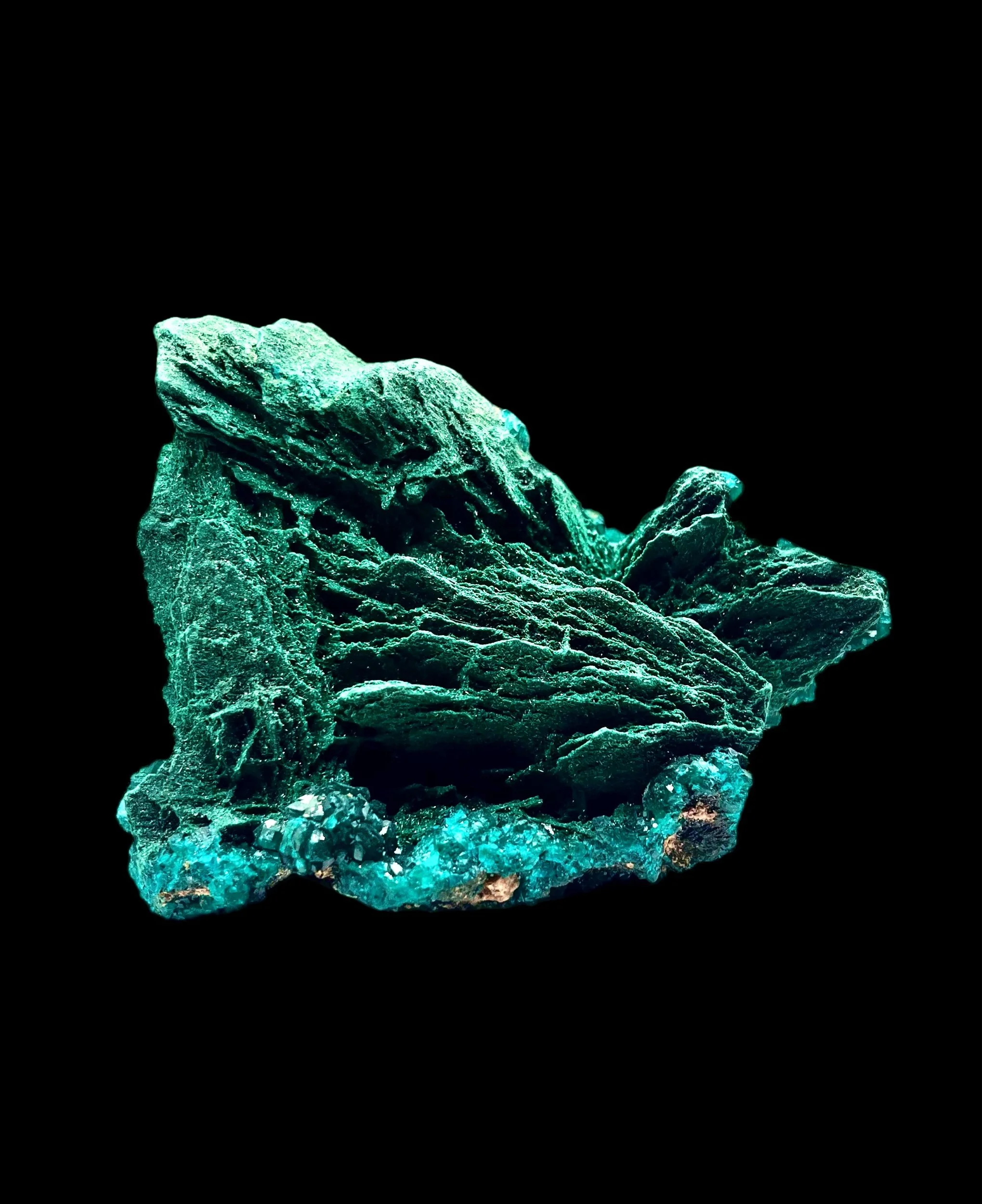 An exquisite union of two copper minerals in perfect harmony — this Dioptase on Malachite specimen captures the essence of The Erongo Mountain’s legendary mineral artistry.