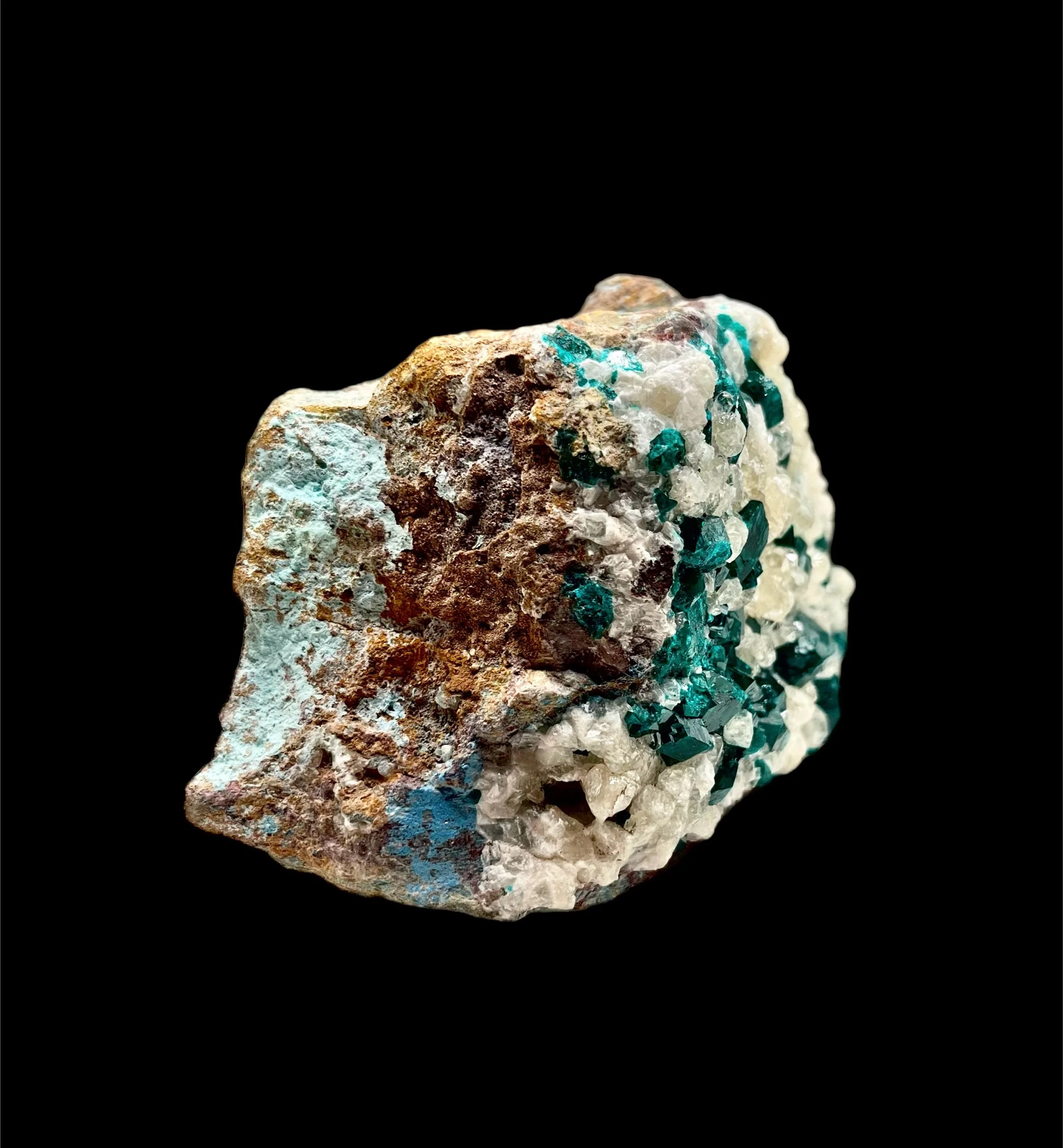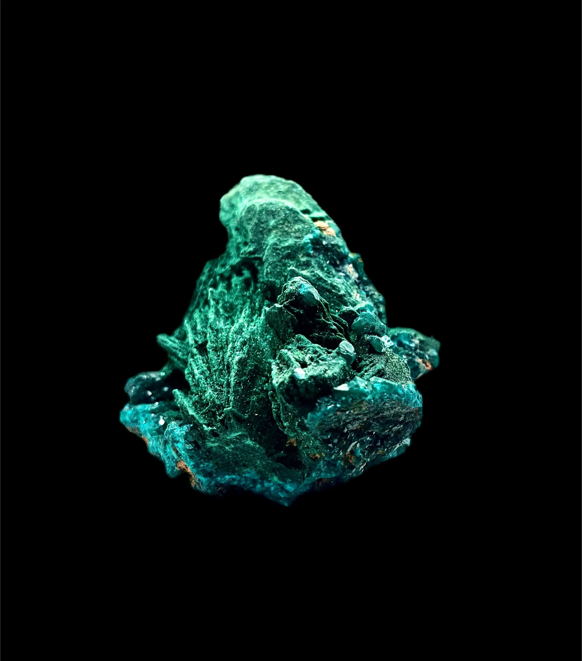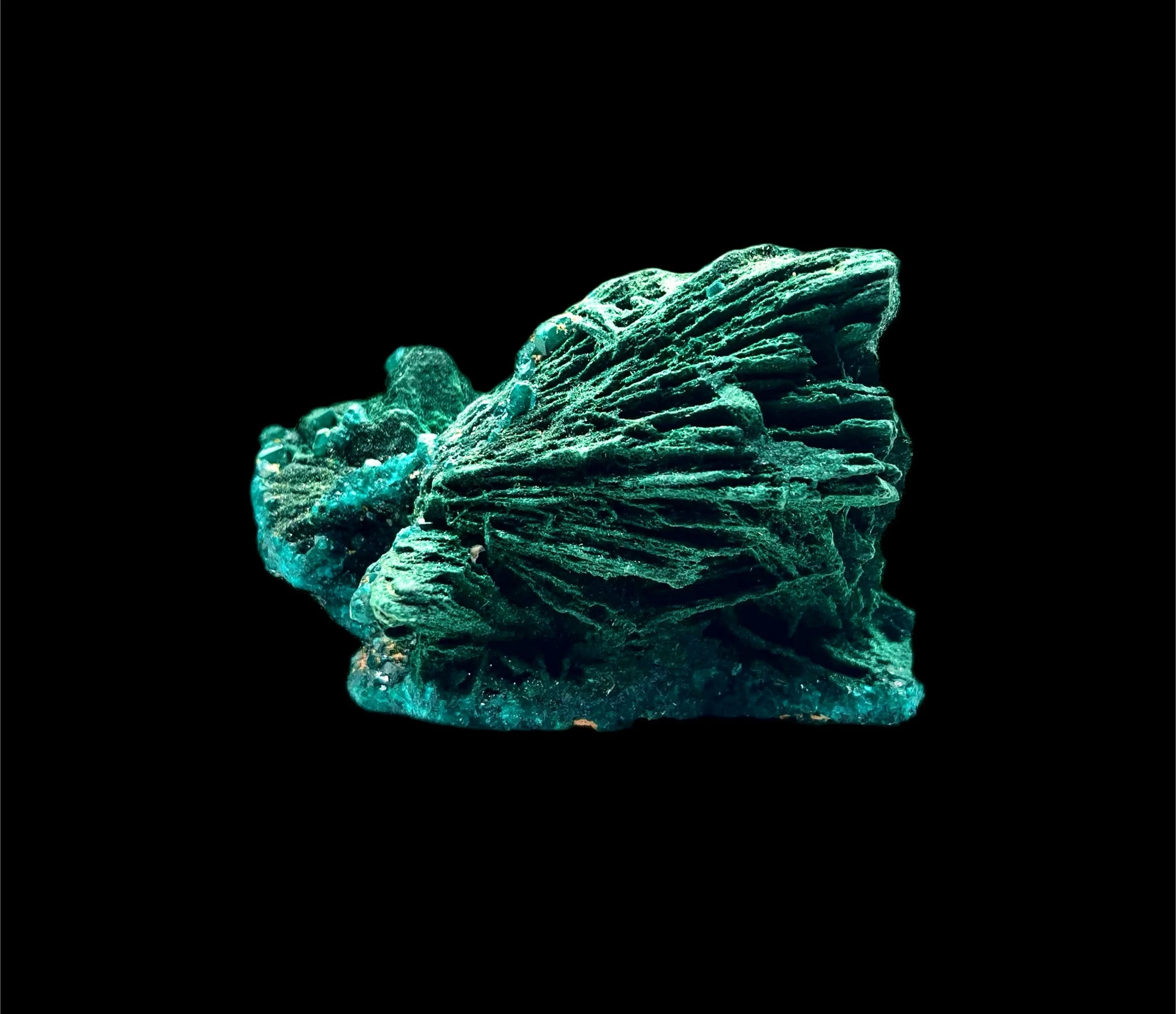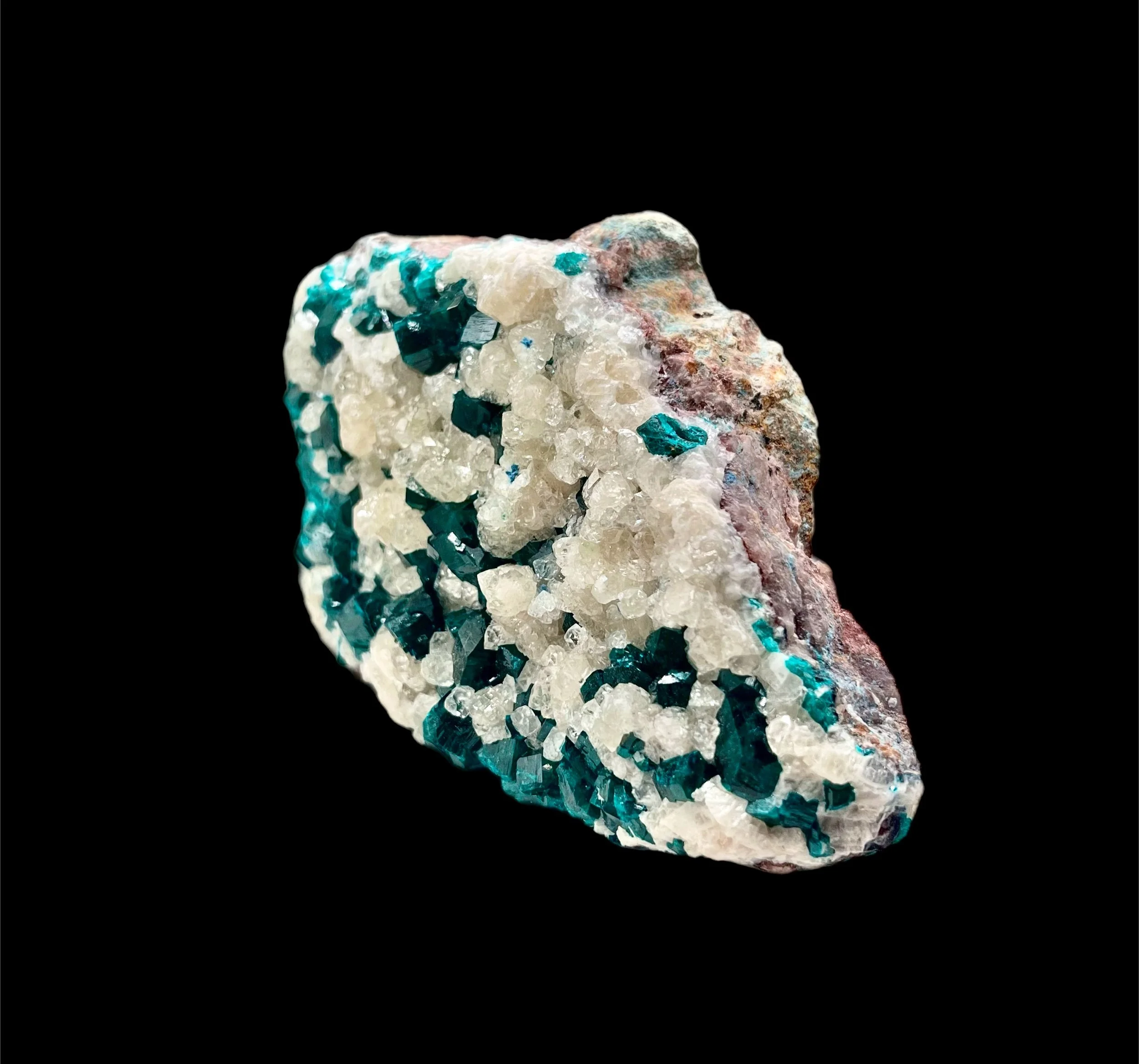 An exquisite union of two copper minerals in perfect harmony — this Dioptase on Malachite specimen captures the essence of The Erongo Mountain’s legendary mineral artistry.