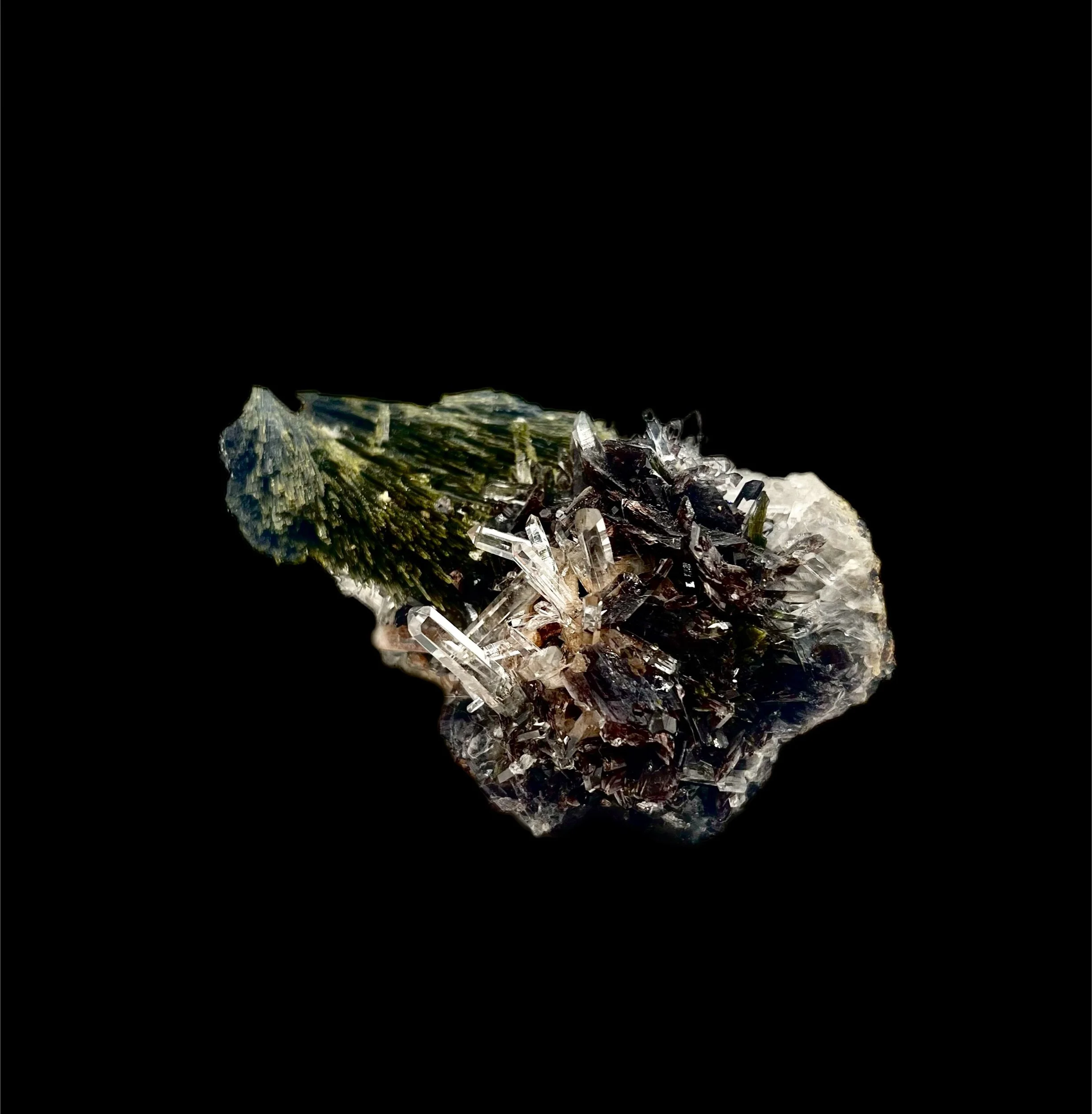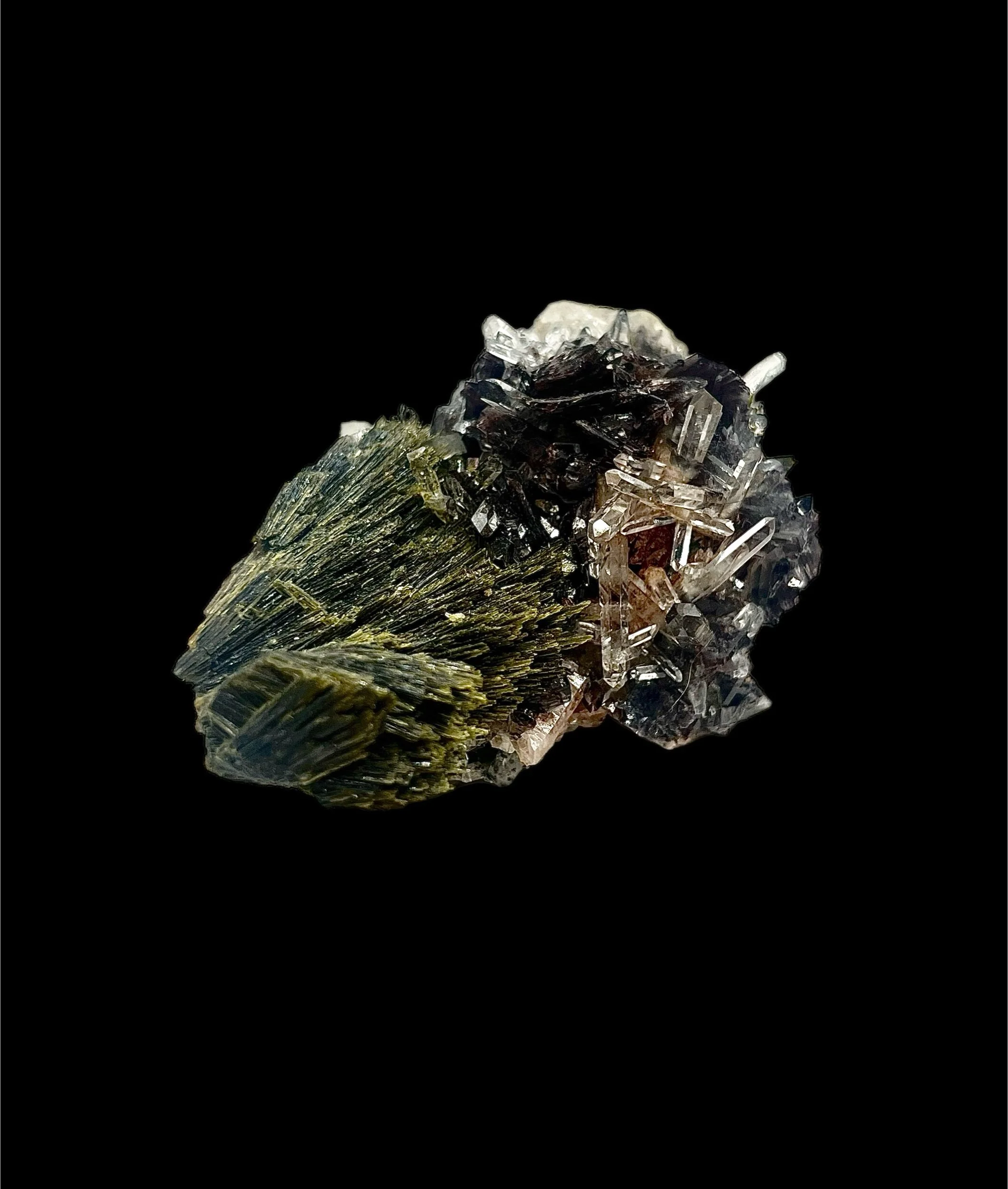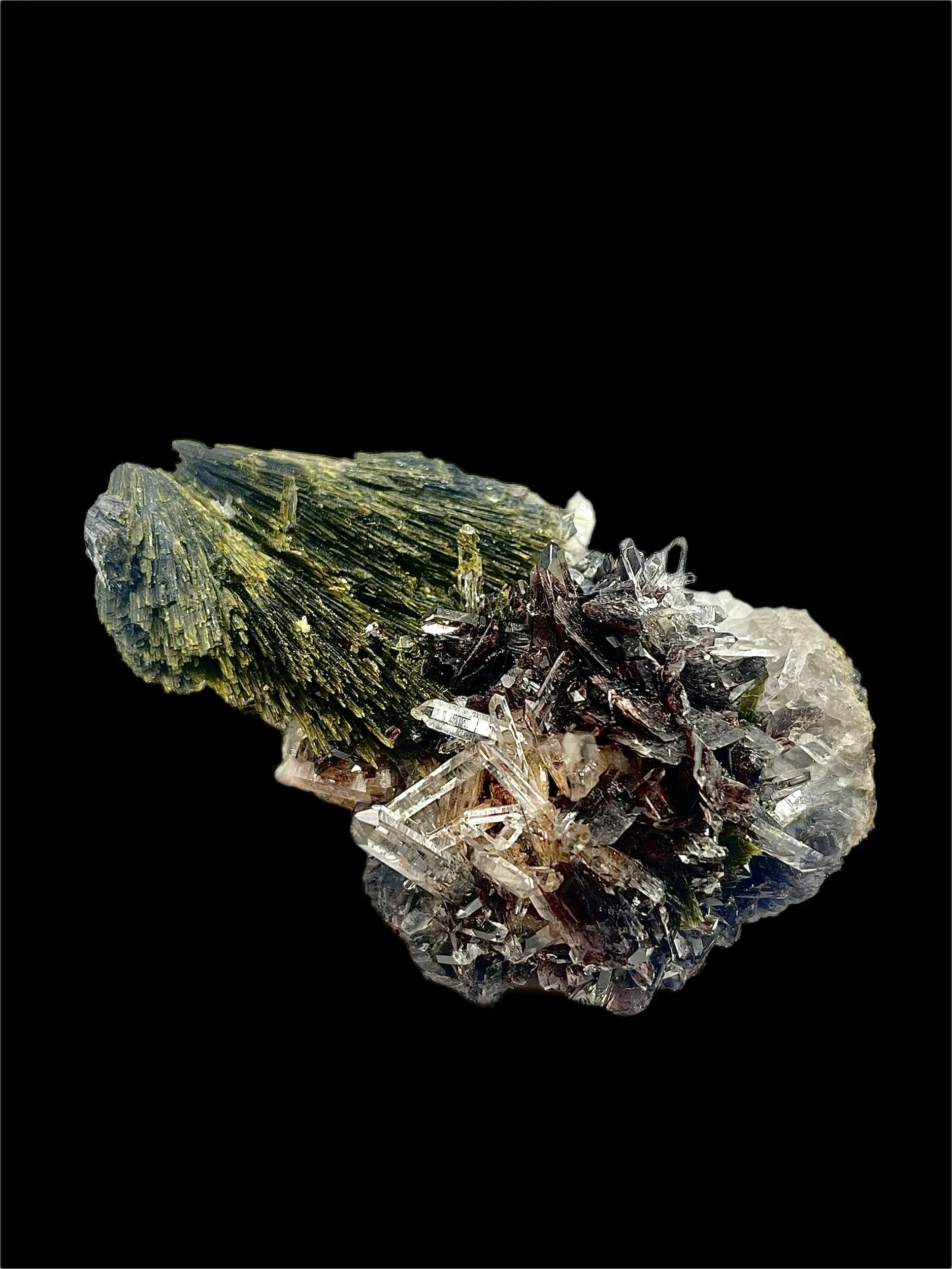 The geometry and intergrowth display a remarkable sense of balance — the Epidote’s bold, striated crystals contrast elegantly with the clarity of the Quartz, while the Axinite adds a bold touch of color and texture. Under directed light, the Axinite reveals amber and bronze reflections, a feature prized among discerning collectors.