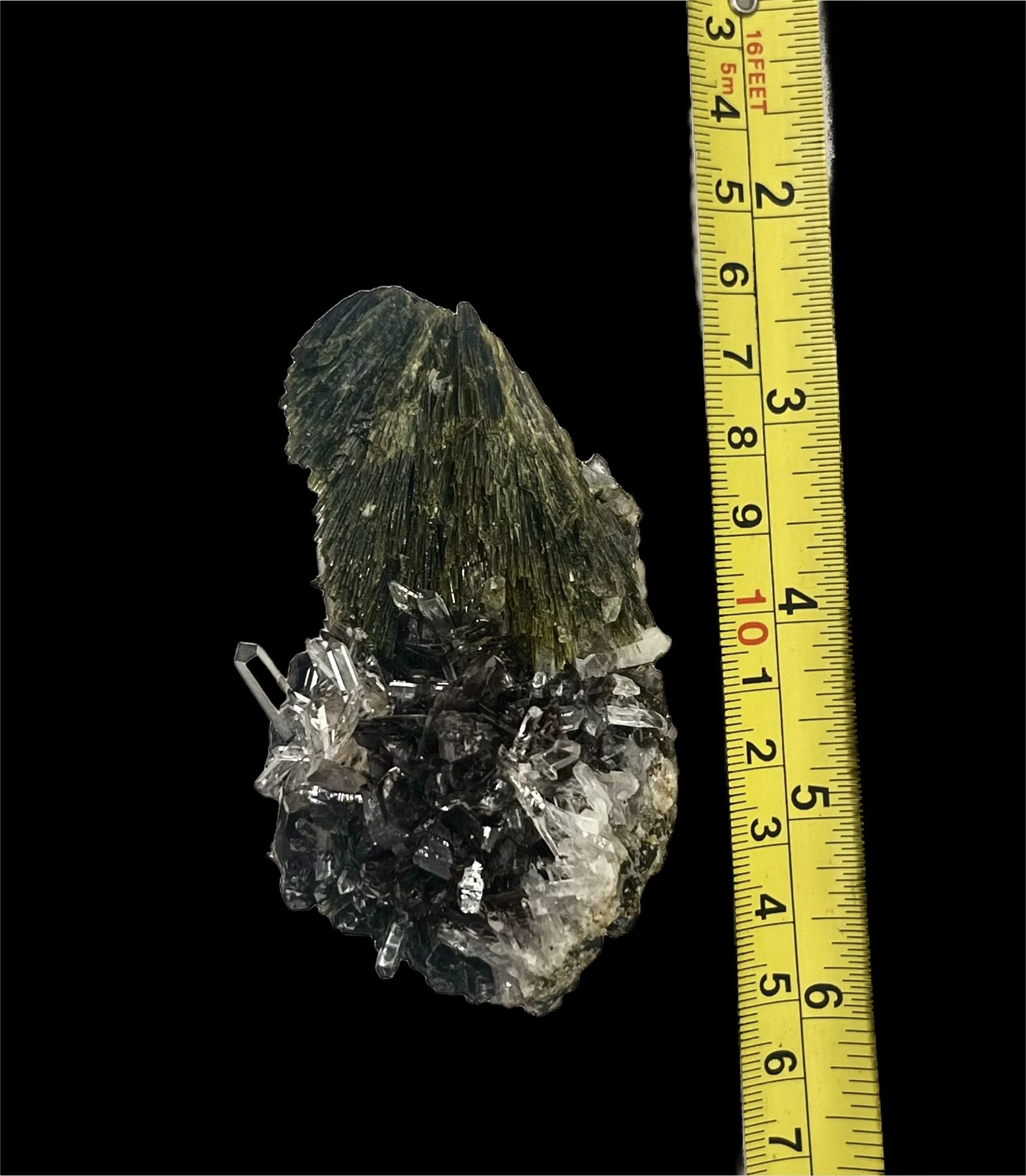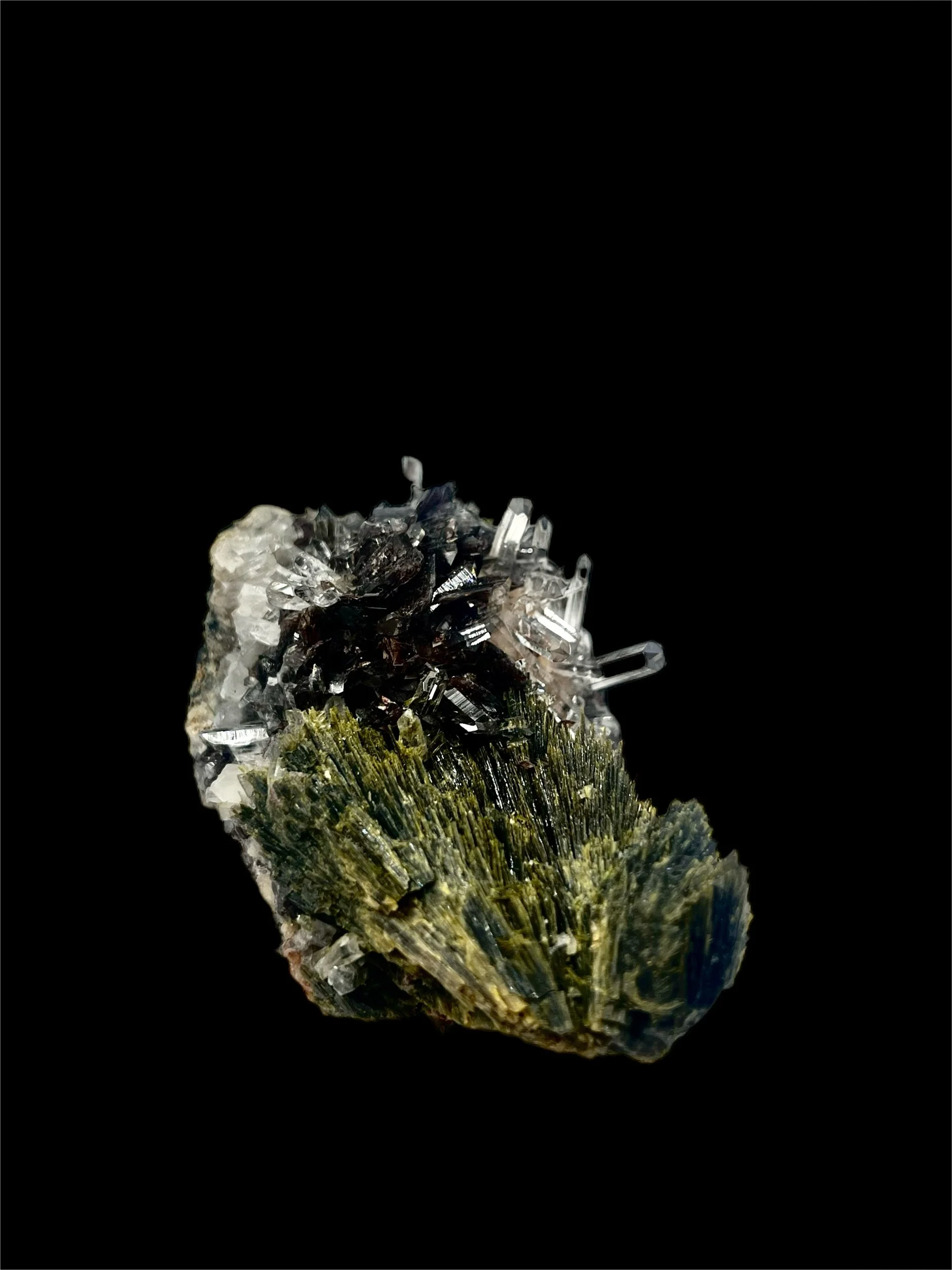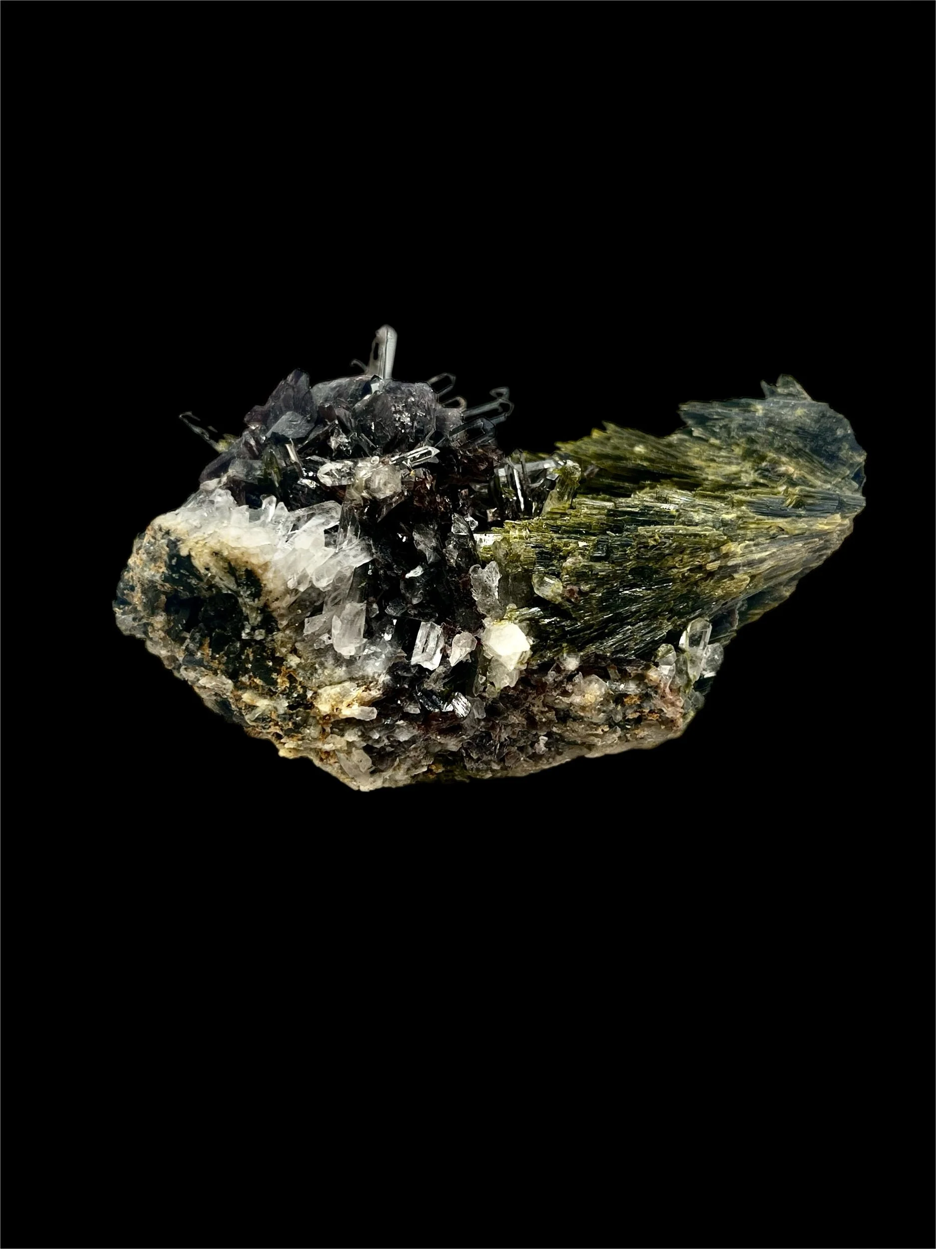 The geometry and intergrowth display a remarkable sense of balance — the Epidote’s bold, striated crystals contrast elegantly with the clarity of the Quartz, while the Axinite adds a bold touch of color and texture. Under directed light, the Axinite reveals amber and bronze reflections, a feature prized among discerning collectors.