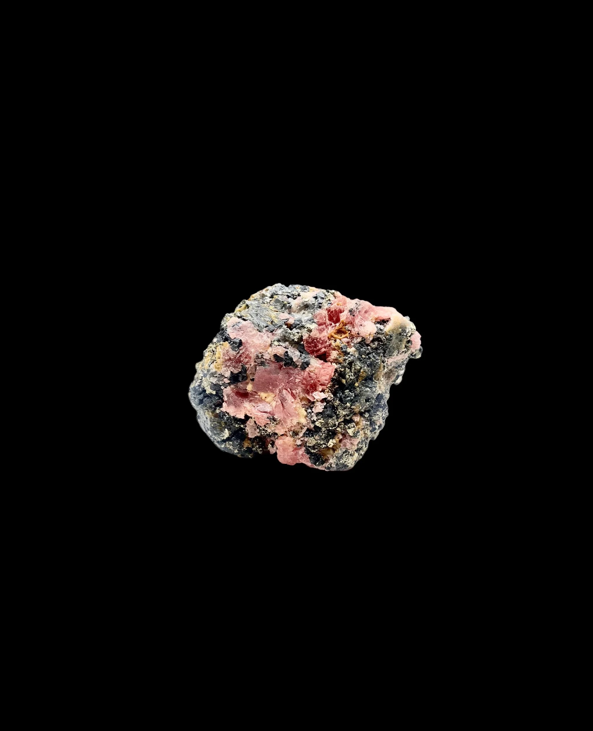 This exquisite rhodochrosite specimen is a collector’s dream, featuring rich, rose-pink rhodochrosite crystals perched on a vibrant matrix with fluorite and sparkling pyrite. What makes this piece truly exceptional is its hidden UV magic: under ultraviolet light, the fluorite and accompanying matrix minerals glow brilliantly, revealing a captivating display of otherworldly colors.