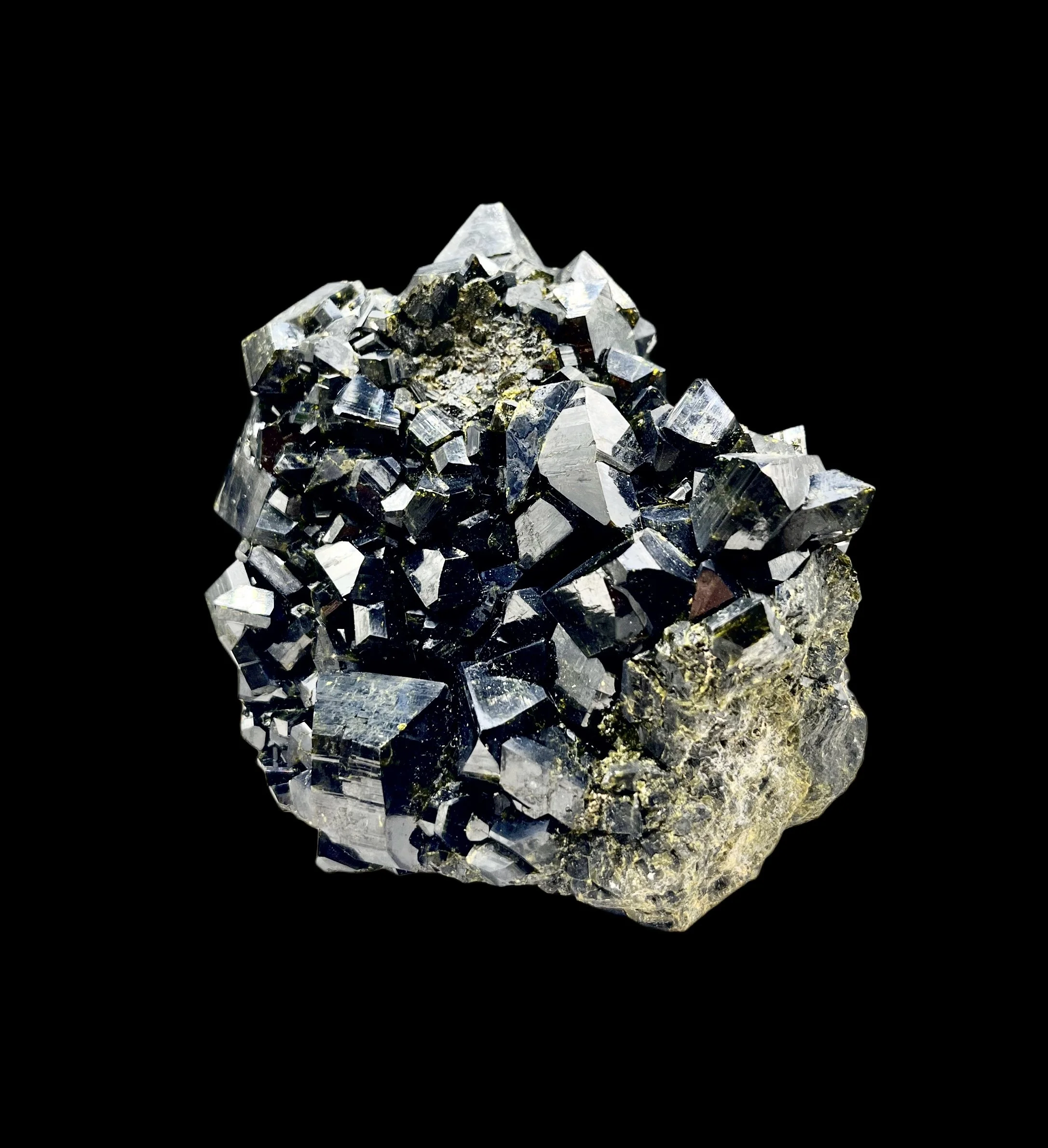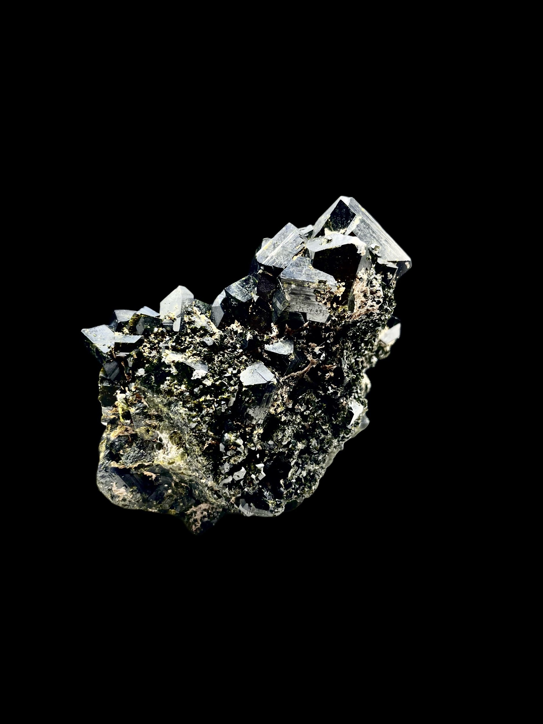 A commanding Peruvian epidote displaying sharply terminated, lustrous crystals of deep green aligned in sculptural precision.